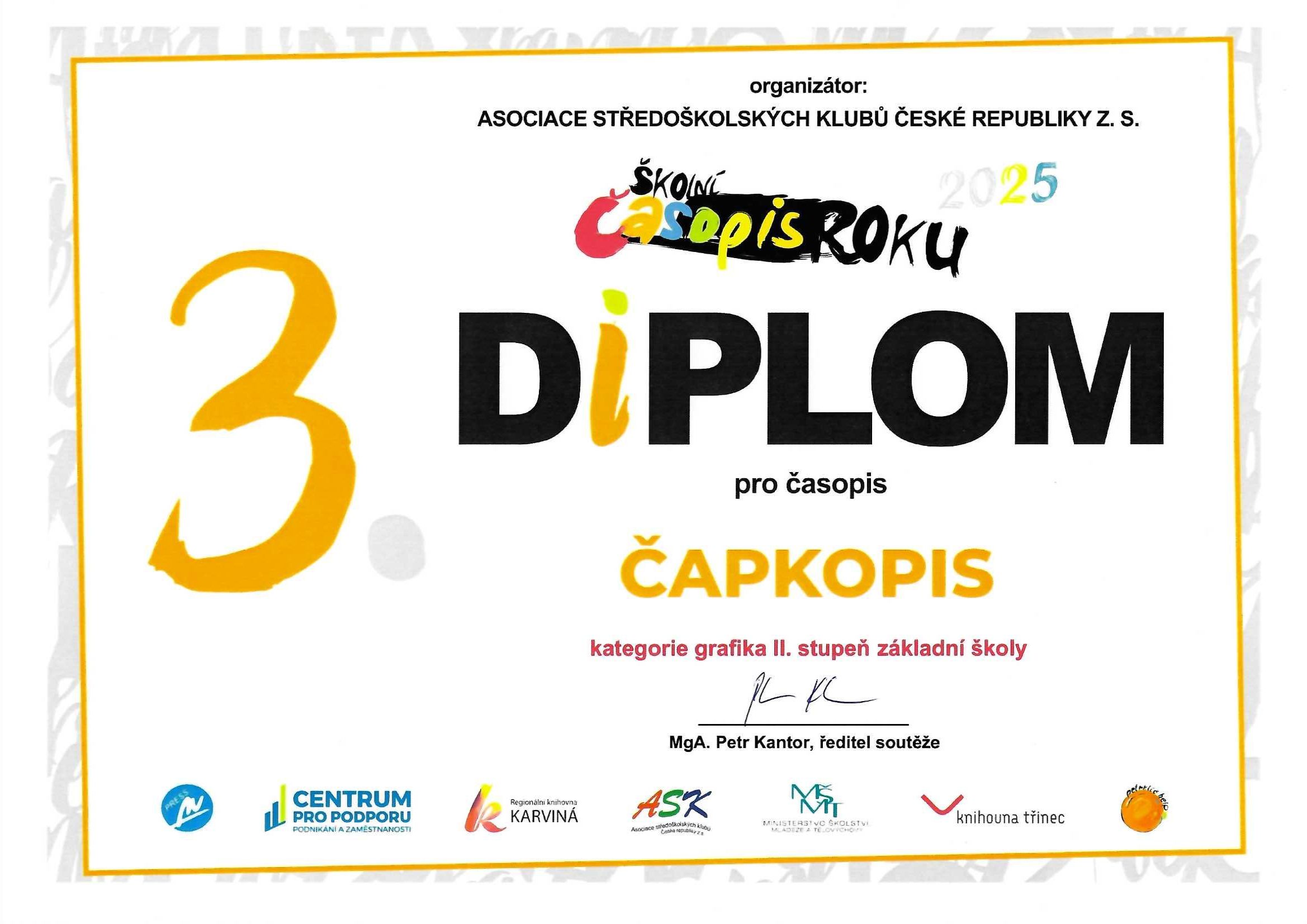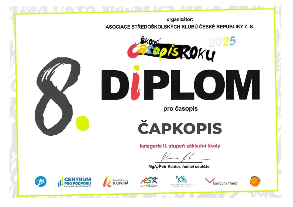 Máme obrovskou radost a důvod k hrdosti! Náš školní časopis Čapkopis dosáhl v prestižní celostátní soutěži Školní časopis roku 2025 vynikajícího výsledku.