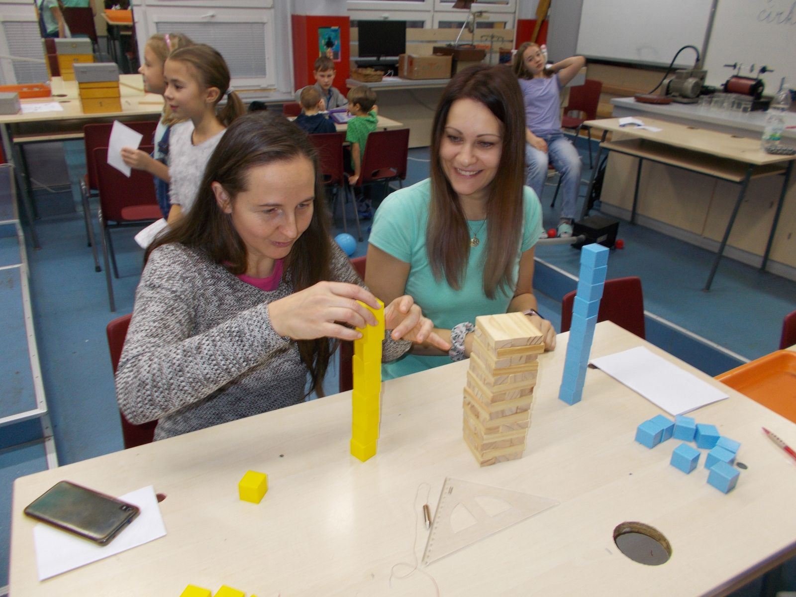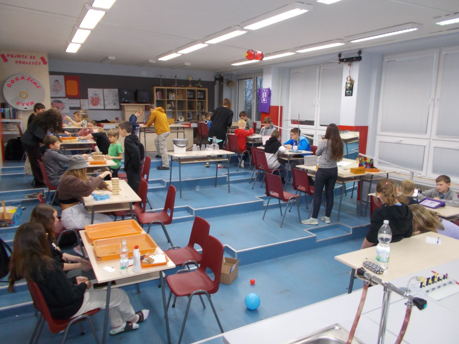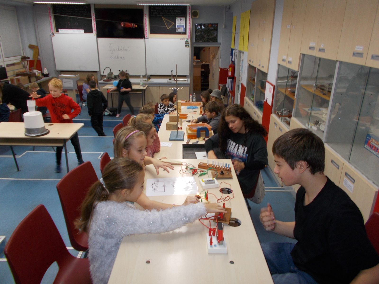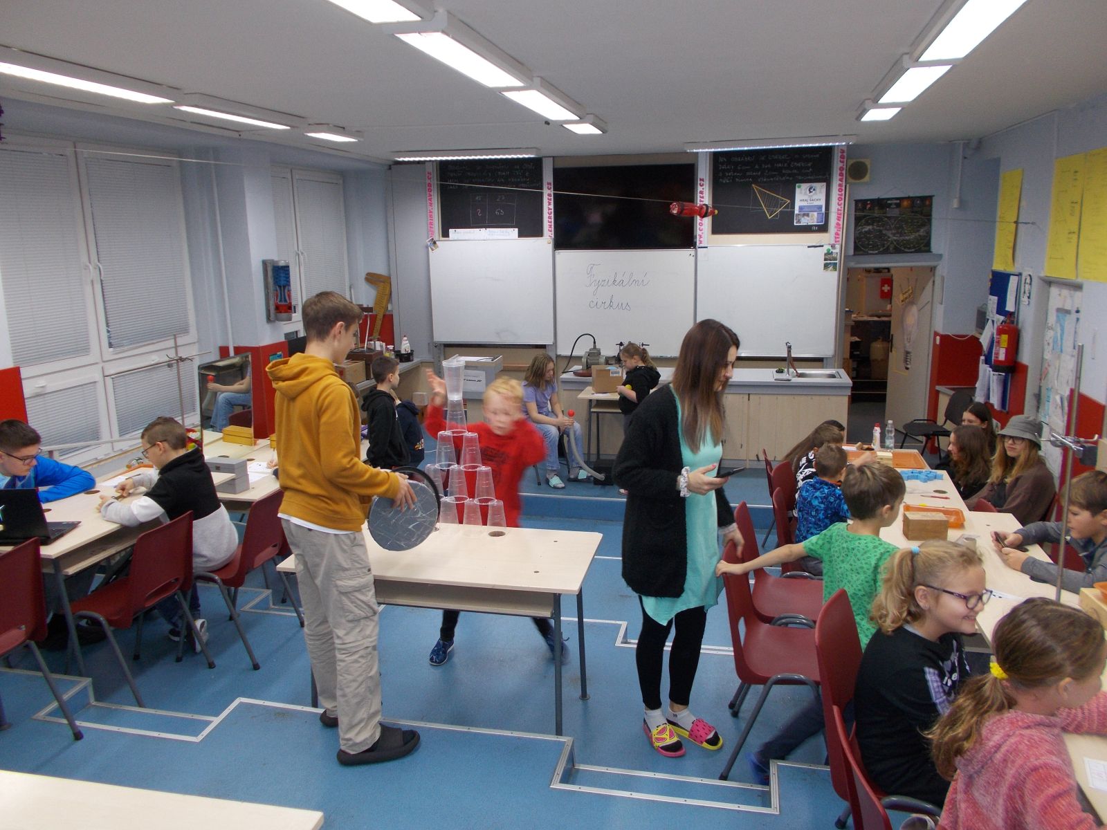 Na závěr čtyřdenního maratonu Fyzikálního cirkusu se ho zúčastnili i žáci z 2. D. A protože bylo opravdu co zkoumat a objevovat, tak se tato zábava protáhla ještě o hodinu déle, než v minulých dnech. Všichni, včetně doprovodu, si užili dostatek hrátek z různých oblastí fyziky a děti se už teď určitě těší, až se za tři a půl roku začnou učit fyziku naostro.