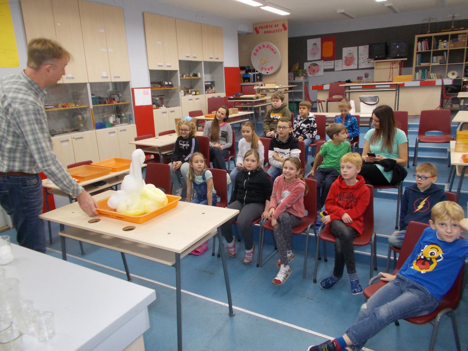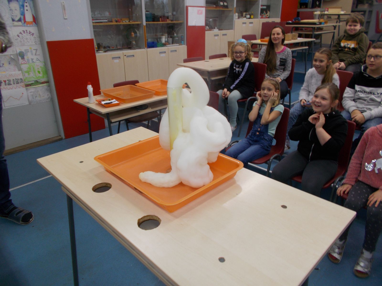 Za chemickou show patří poděkování panu učiteli Pechancovi, který zařídil pěnění, šumění, bublání i exploze všeho druhu. A po celé čtyři dny se o všechny druháky z naší školy starali sedmáci a osmáci, kteří buď naši školu reprezentují v různých soutěžích, anebo jsou vynikající ve fyzice. V průběhu celého cirkusu se ukázali nejen jako odborníci ve svém předmětu, ale i jako citliví průvodci světem vědy.