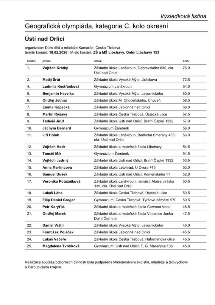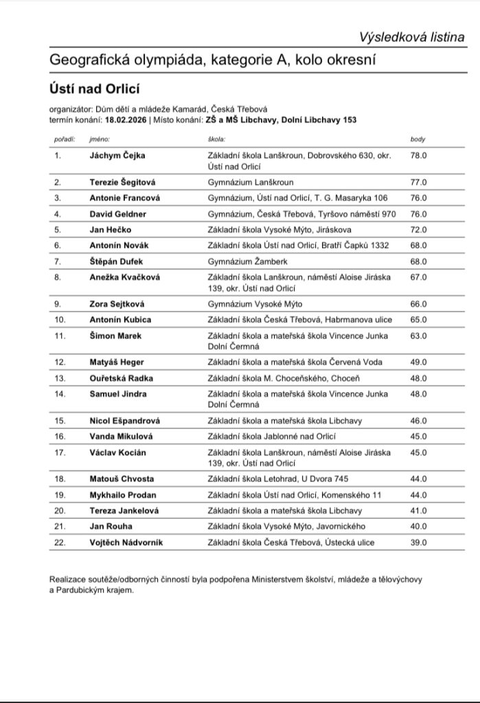 Ve středu 18. února se tři naši žáci zúčastnili okresního kola Geografické olympiády, do kterého postoupili jako nejlepší řešitelé školního kola. Soutěž se konala na ZŠ Libchavy a na žáky čekaly tři disciplíny – znalostní zeměpisný test, práce s mapou a závěrečná praktická část.