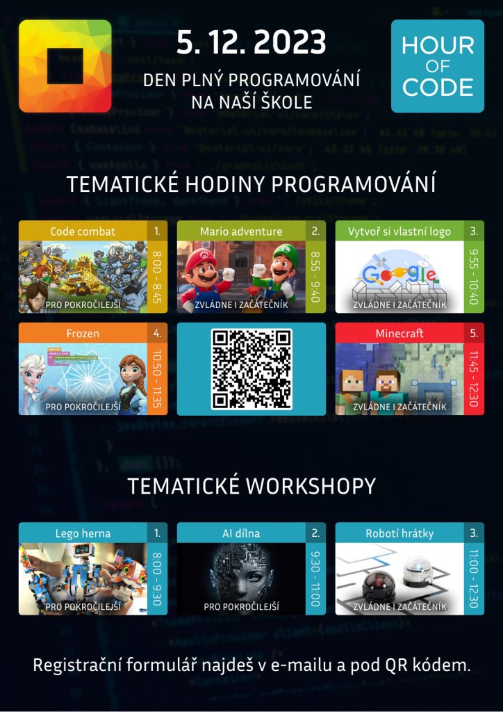 V úterý 5. 12. si tak v průběhu dopoledne naši žáci můžou vybrat z 5 tematických lekcí a 3 speciálních workshopů, které jim umožní nakouknout do světa kódu.