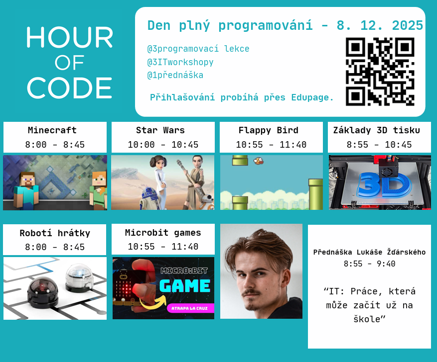 Dnešním dnem započala možnost přihlašování se na každoroční akci Hour of Code, která se letos uskuteční v pondělí 8. 12. 2025 od 8:00. Aktivity, workshopy a přednášky budou probíhat v počítačových učebnách. Žáci budou mít možnost se seznámit či si zopakovat blokové programování, naprogramovat si vlastního robota, vyzkoušet si 3D tisk nebo si vyslechnout zajímavou přednášku o studiu a možnosti přivýdělku v IT oboru.