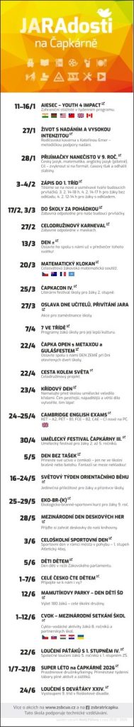 Interaktivní poster pro II. pololetí školního roku 2025/2026 přináší přehled významnějších akcí, které jsme připravili nejen pro naše žáky, ale i pro Vás – rodiče, prarodiče a všechny přátele školy. Budeme moc rádi, pokud si některou z uvedených událostí vyberete a podpoříte nás svou návštěvou. Vaše účast je totiž tou největší JARAdostí.