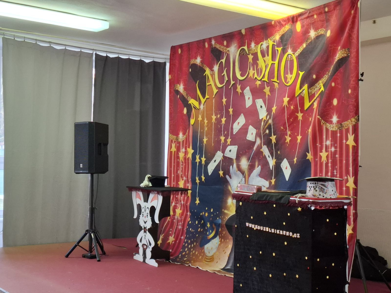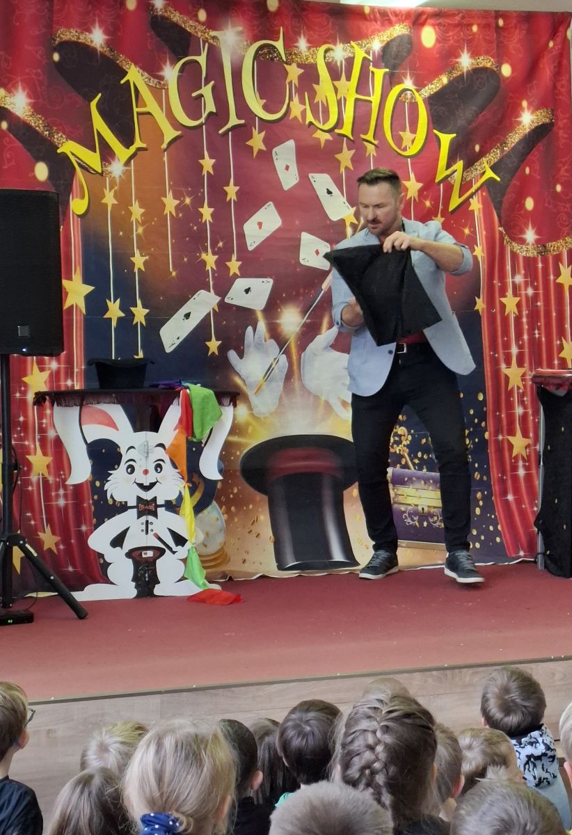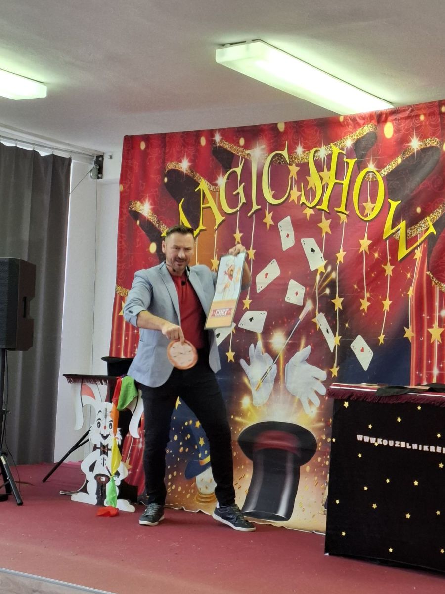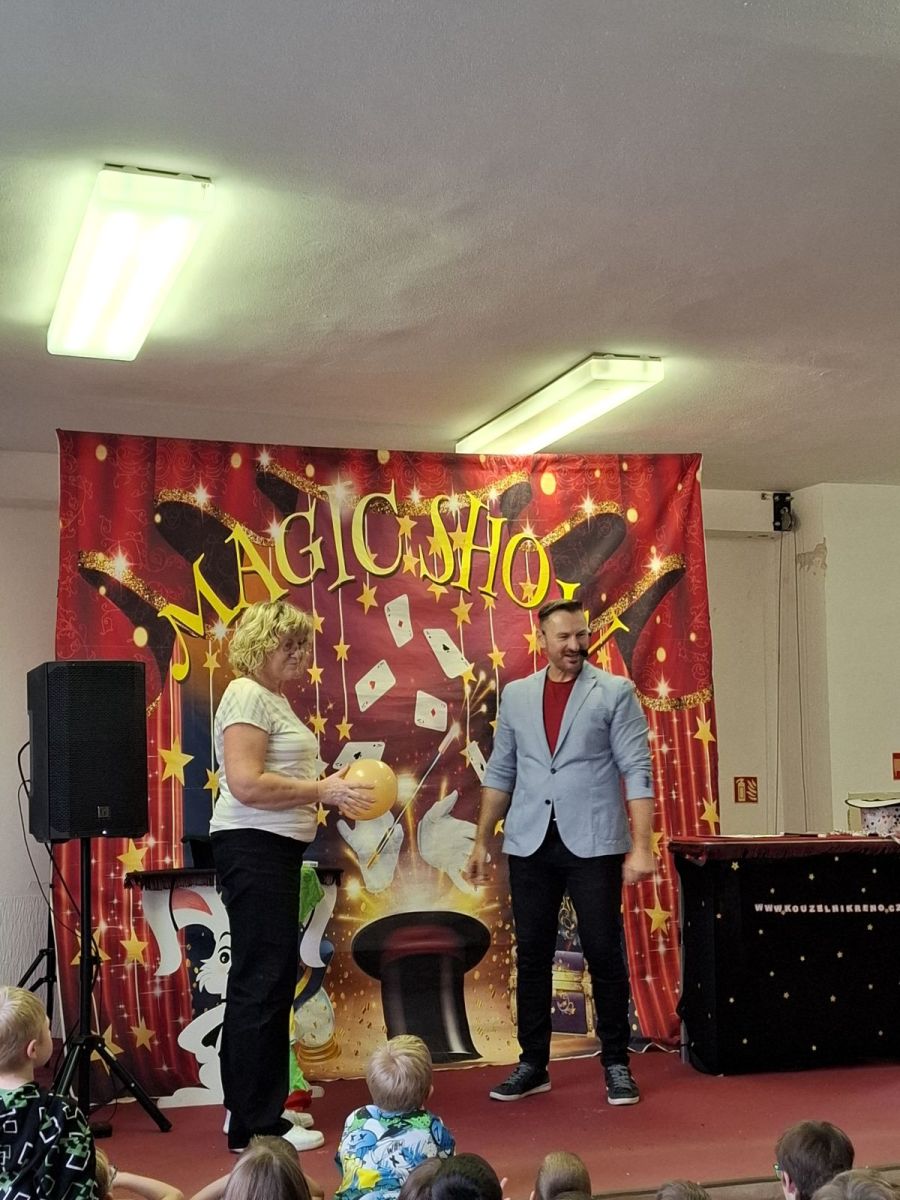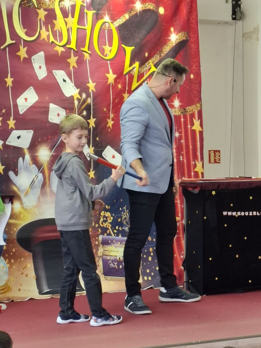 V pátek 21. listopadu 2025 se školní jídelna proměnila v kouzelné jeviště. Na pódium dorazil kouzelník Reno, aby svým vystoupením pobavil více než 120 děti ze školní družiny.