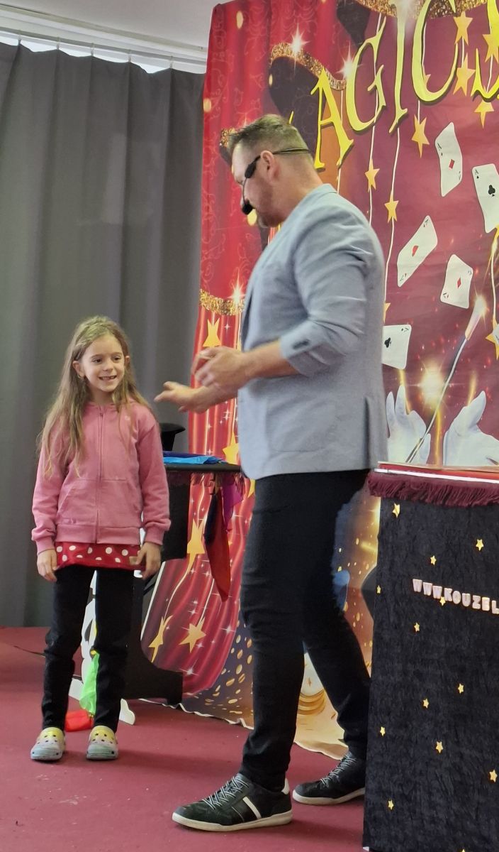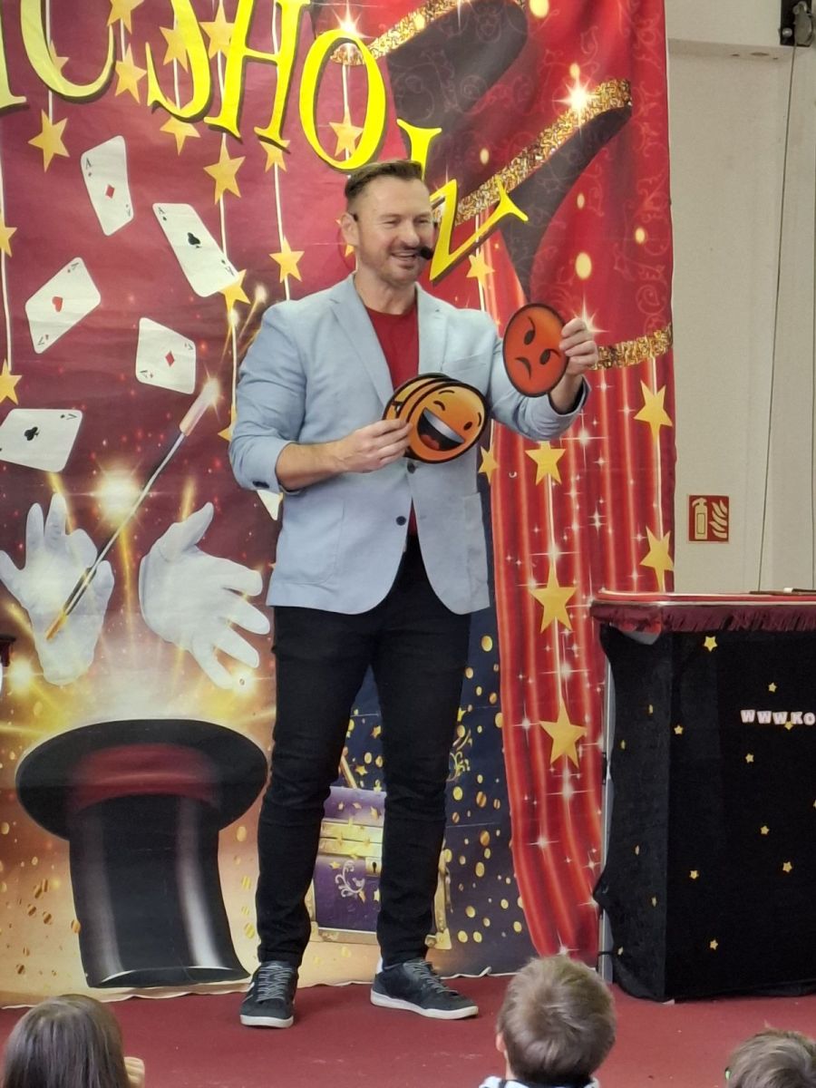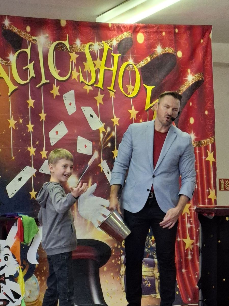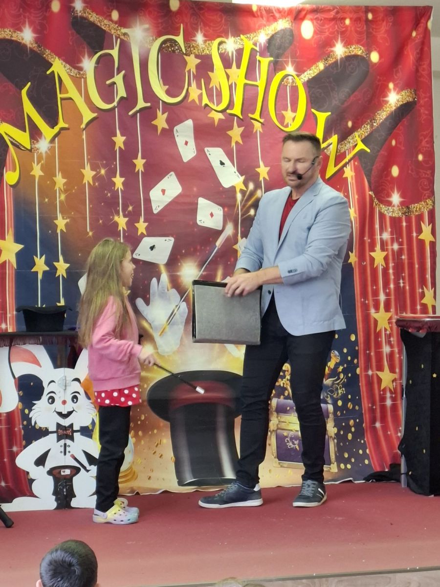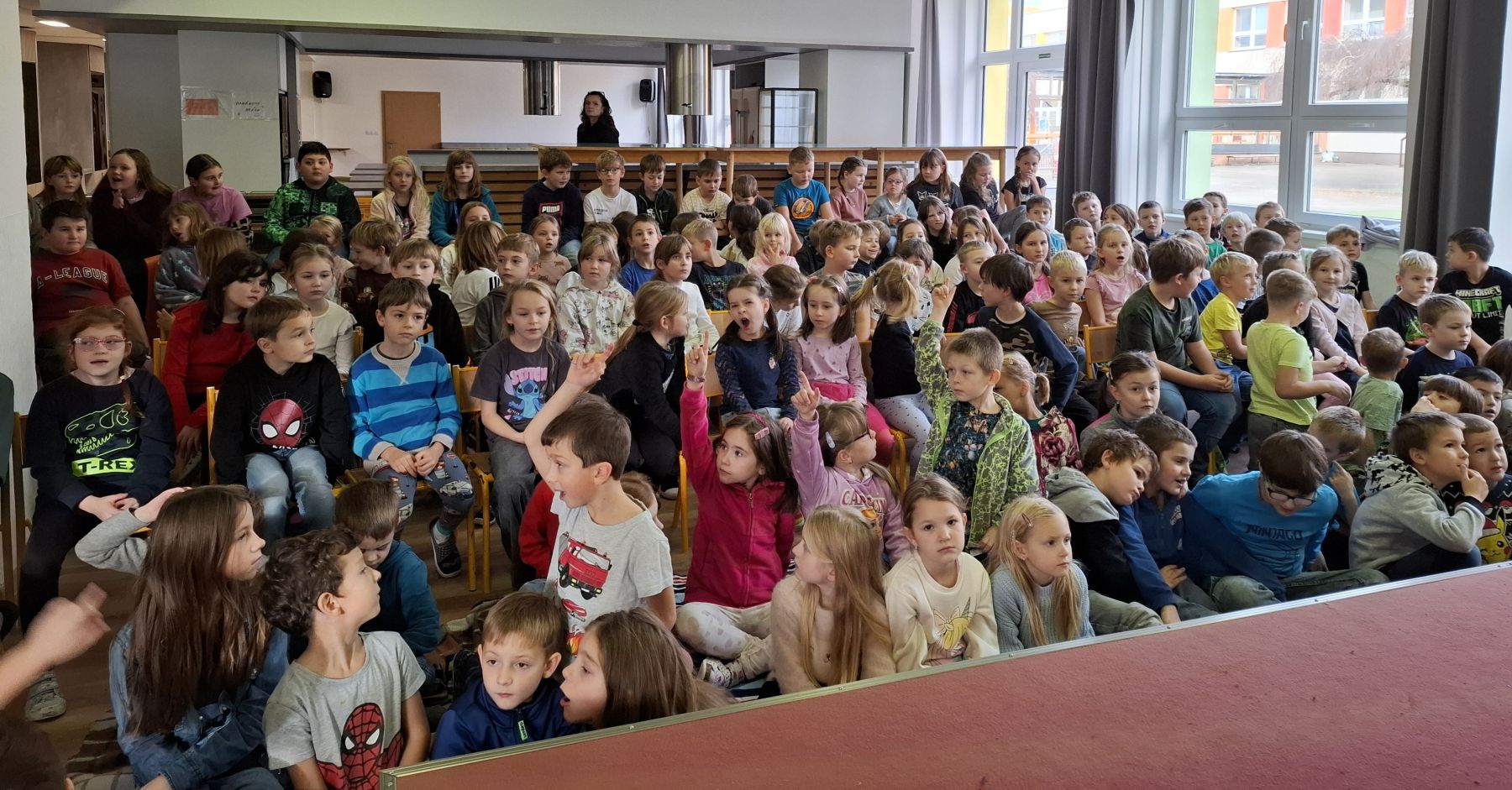 V pátek 21. listopadu 2025 se školní jídelna proměnila v kouzelné jeviště. Na pódium dorazil kouzelník Reno, aby svým vystoupením pobavil více než 120 děti ze školní družiny.