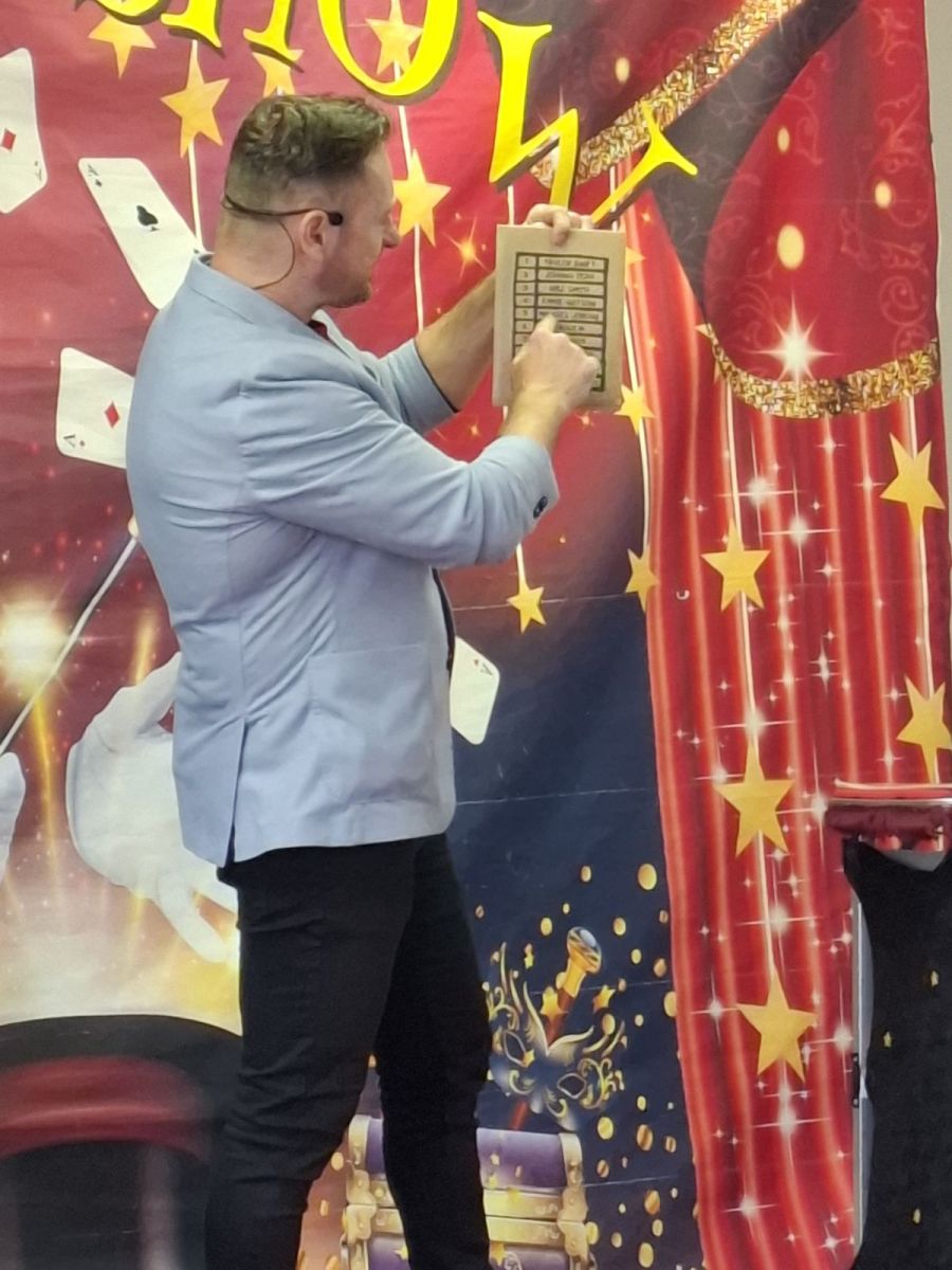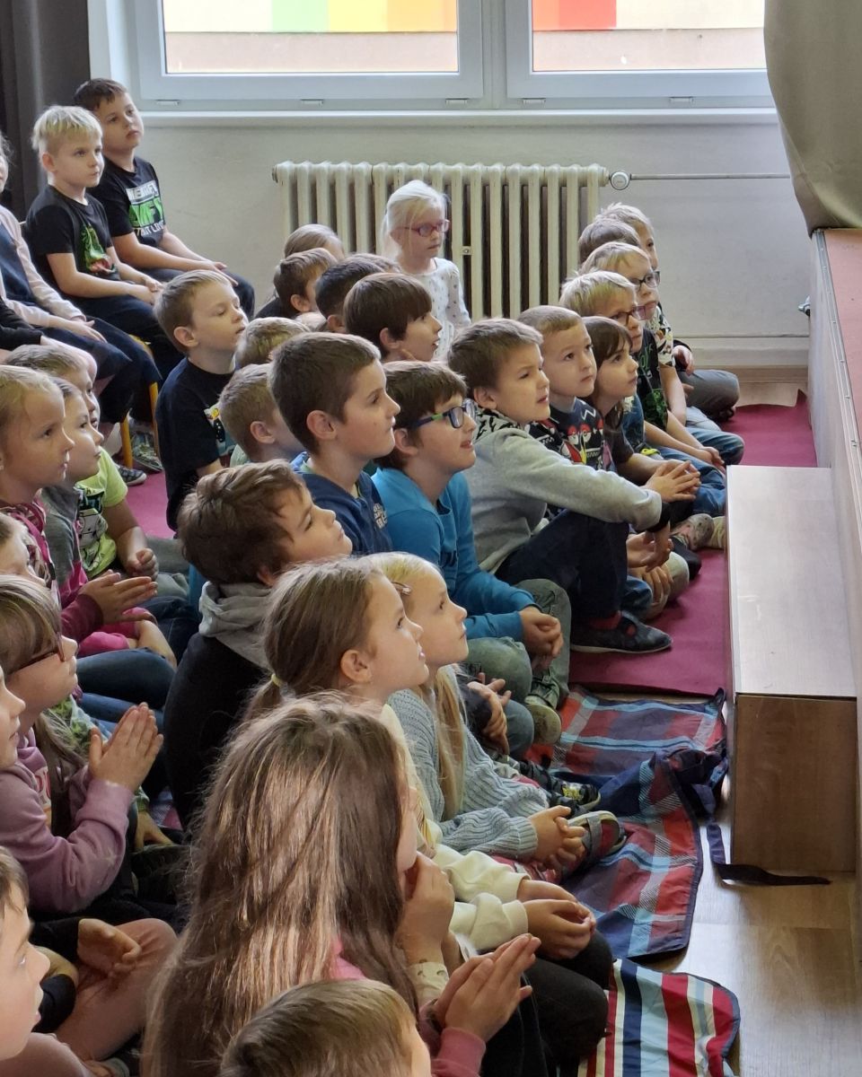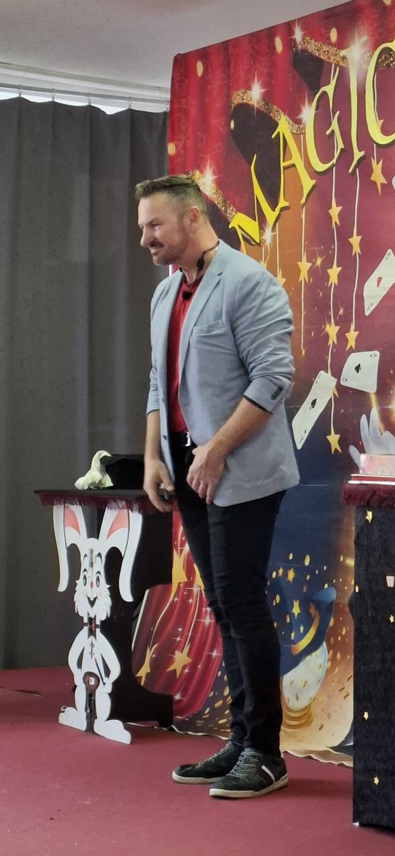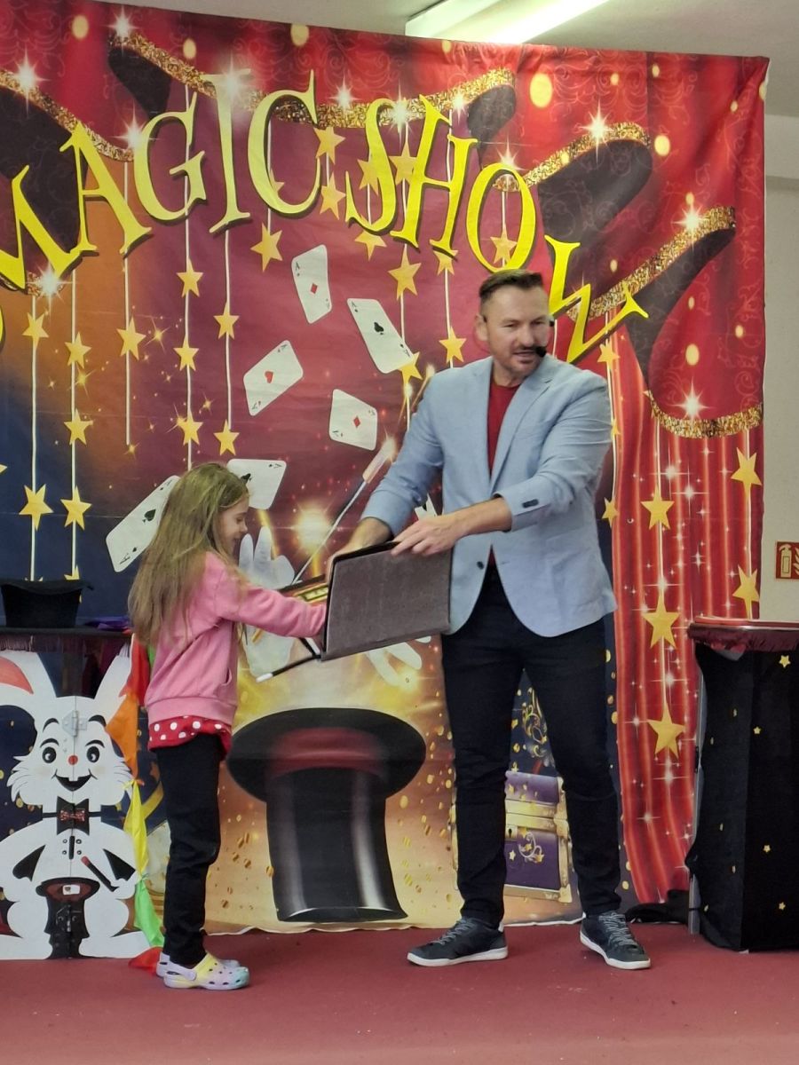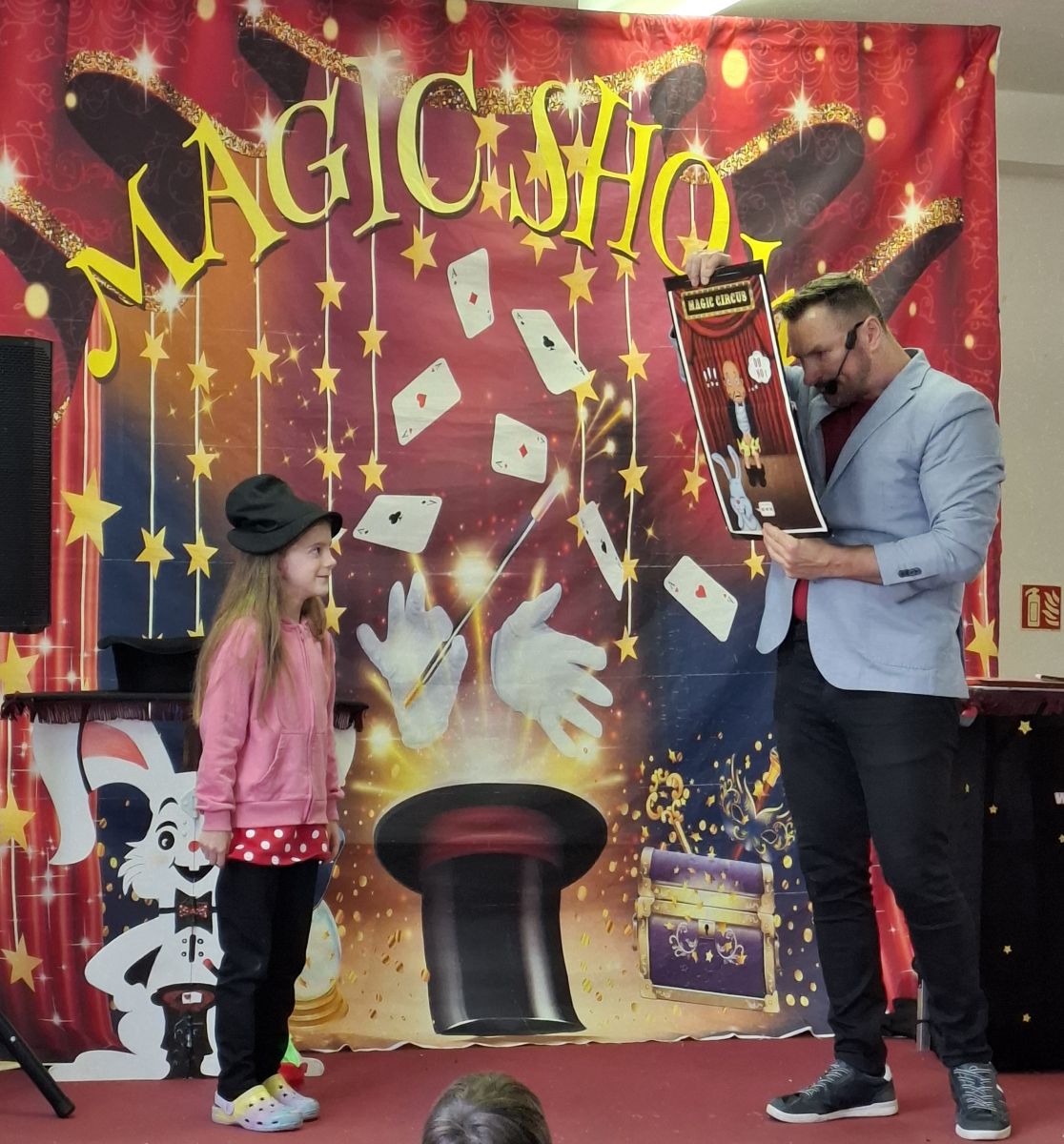 V pátek 21. listopadu 2025 se školní jídelna proměnila v kouzelné jeviště. Na pódium dorazil kouzelník Reno, aby svým vystoupením pobavil více než 120 děti ze školní družiny.