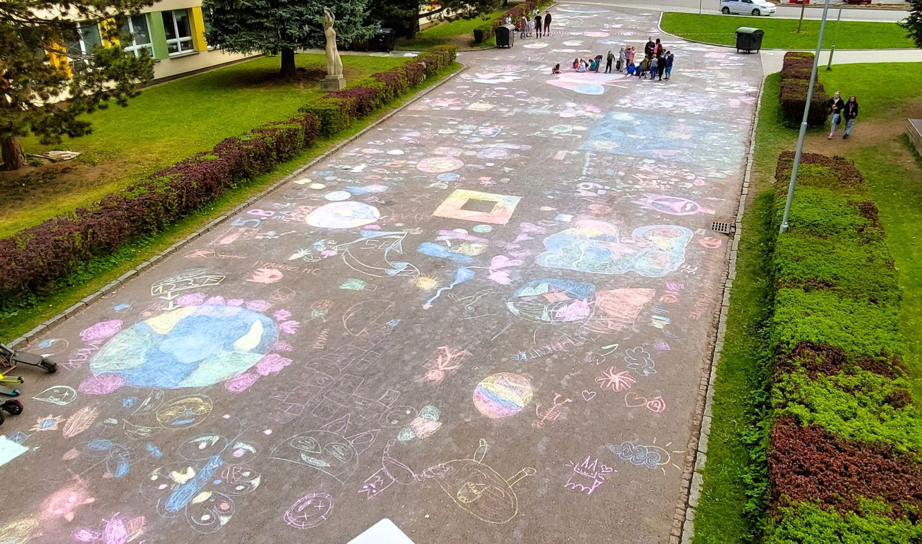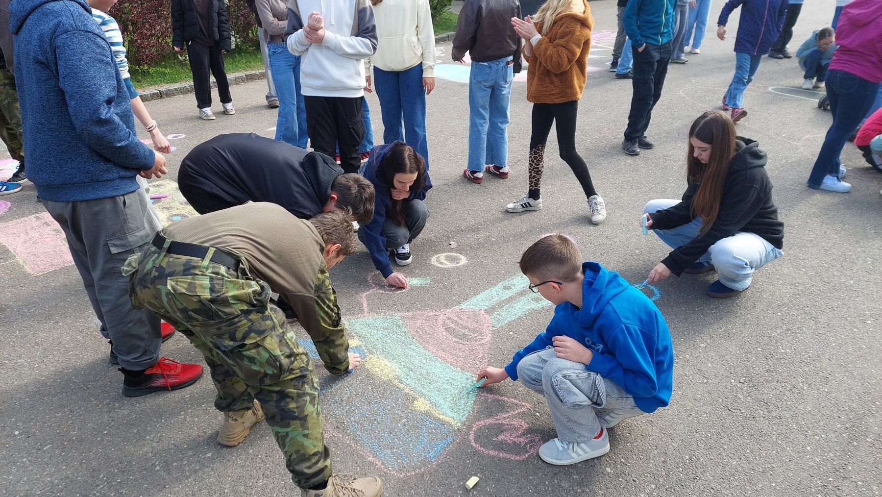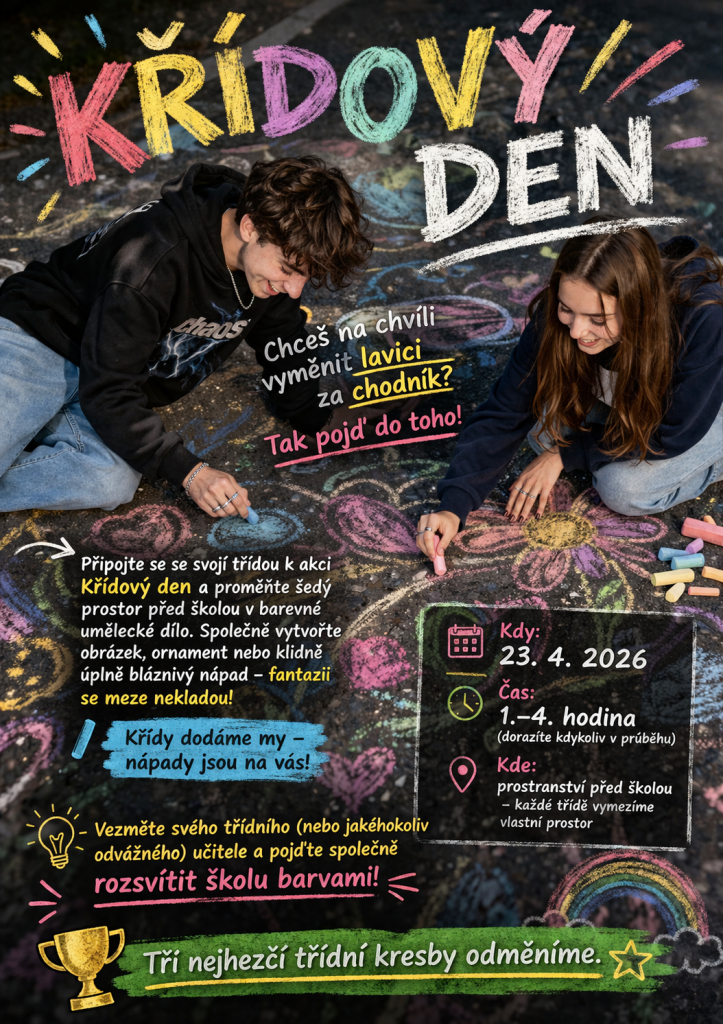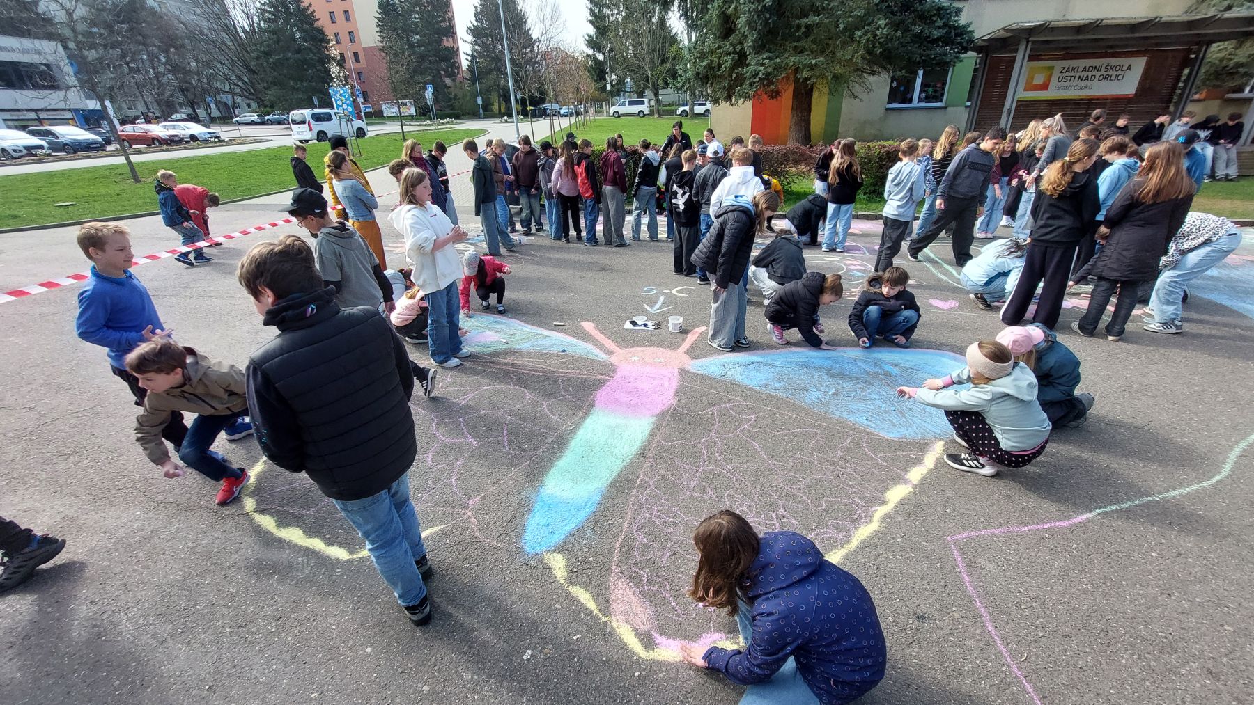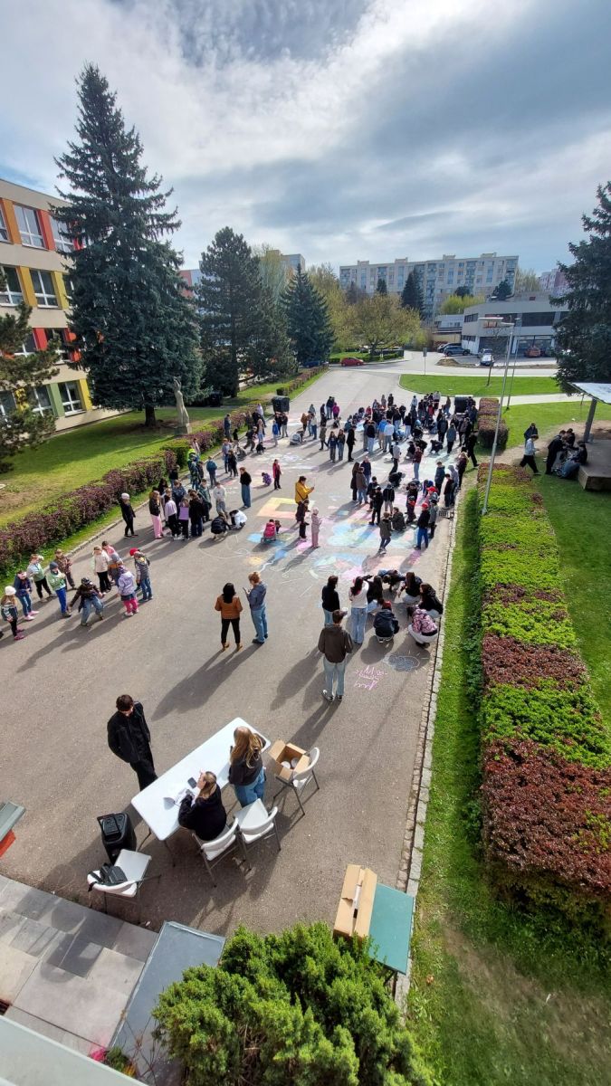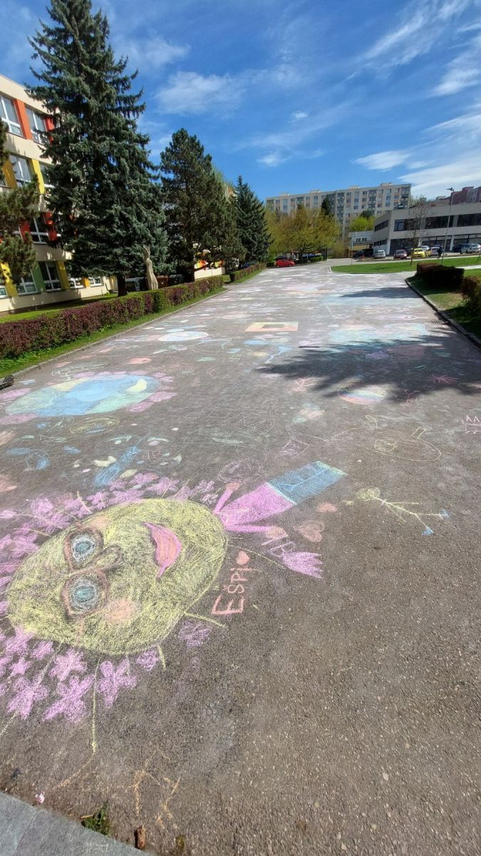 Pohoda, slunce, smích a spousta barev k tomu. Obrovské díky patří téměř třem desítkám tříd, které se zapojily do našeho Křídového dne. Cíl byl jasný – rozzářit prostor před školou. A to se povedlo víc než skvěle.