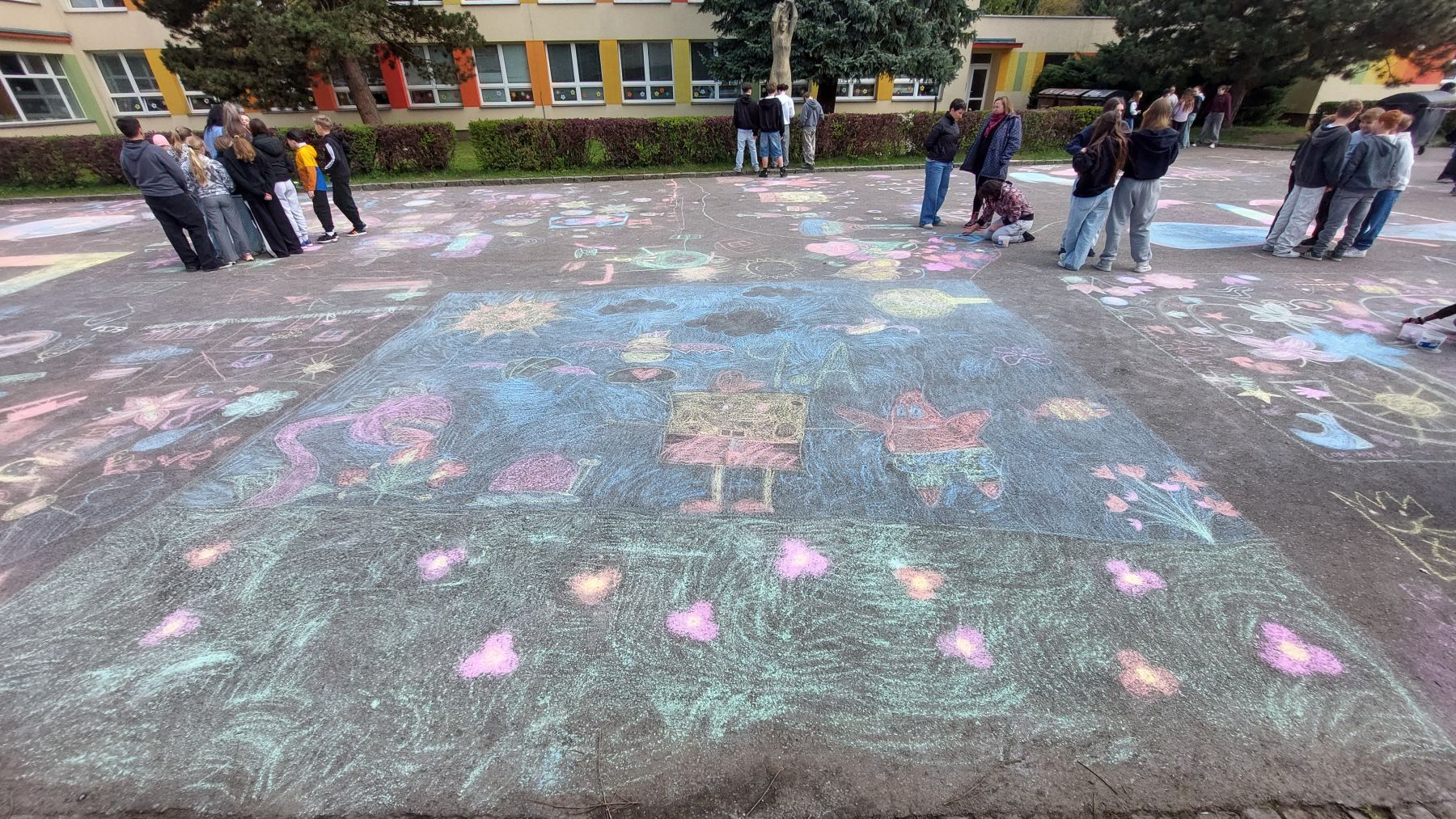 Chodník před školou teď žije barvami, nápady a parádními kresbami. Zapojili se malí i velcí – od prvňáčků až po deváťáky. Každý přidal něco svého a dohromady z toho vzniklo skvělé dílo.