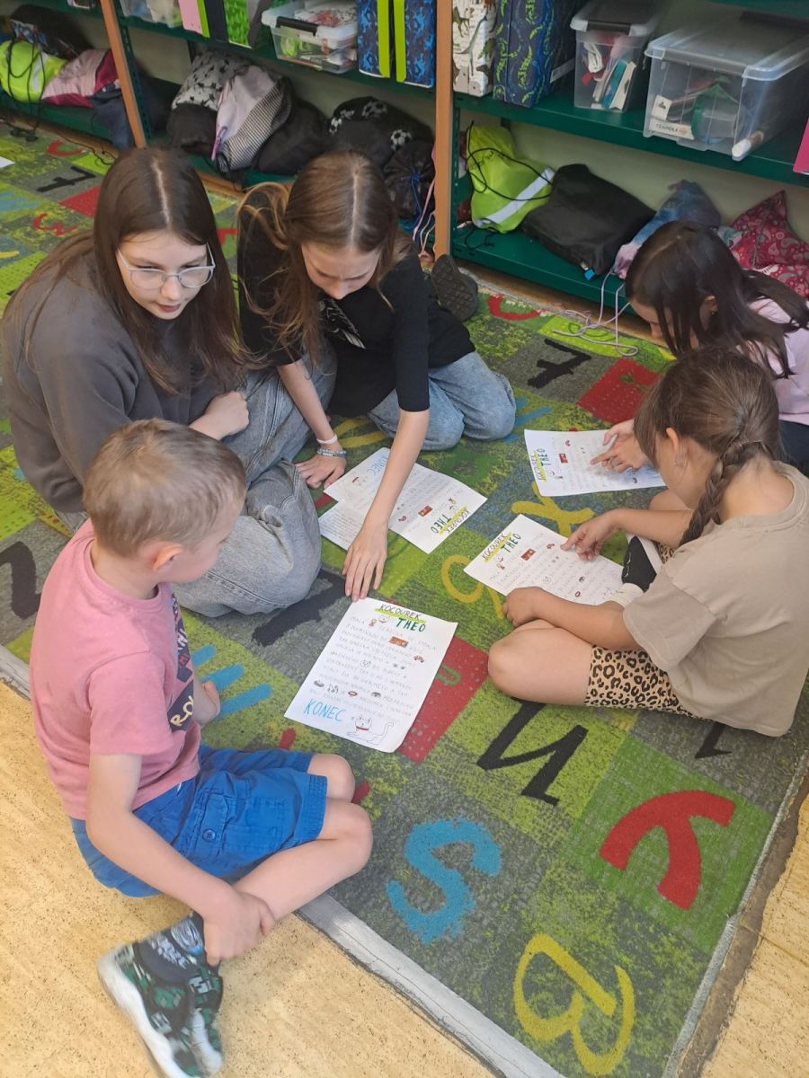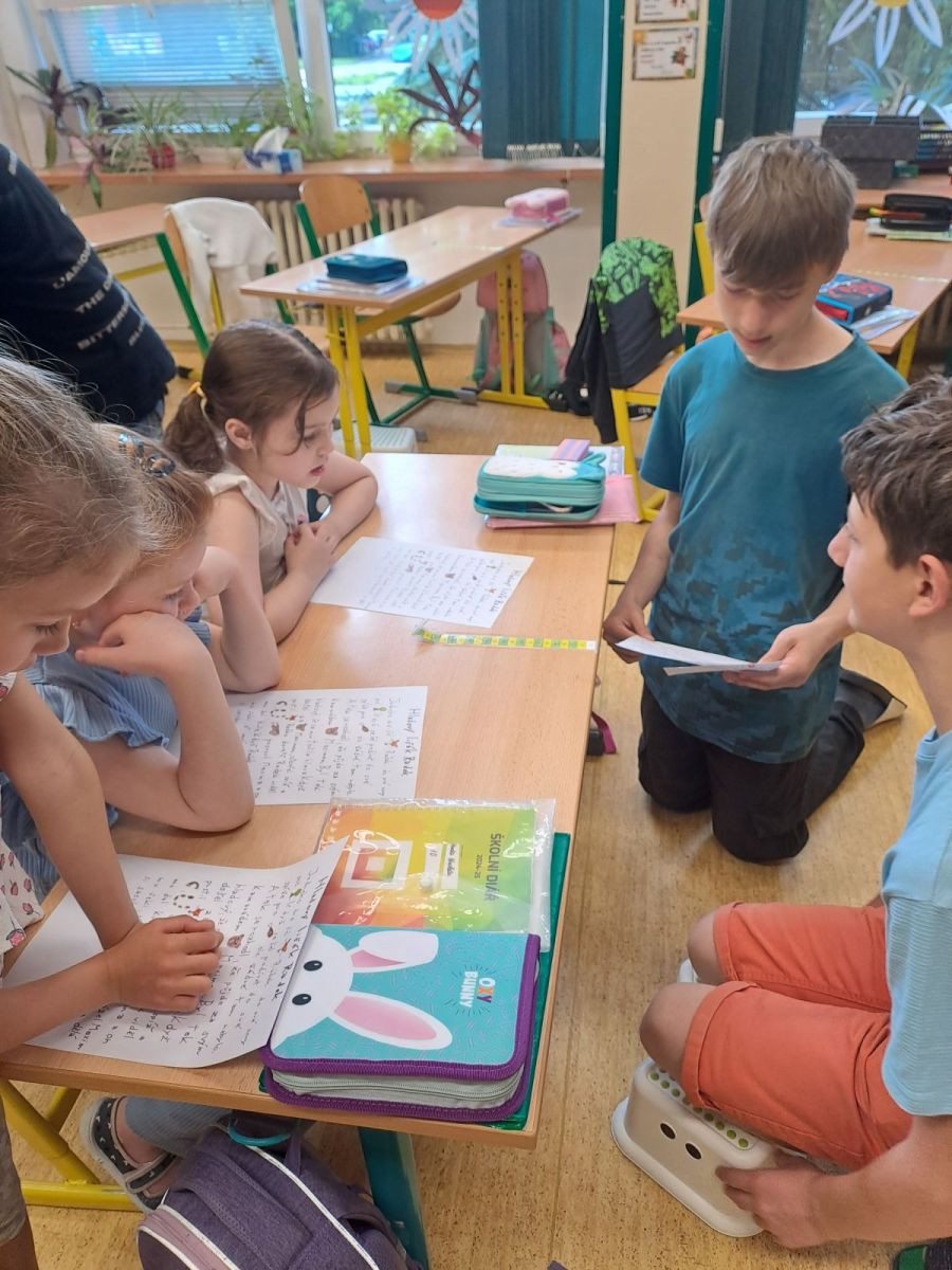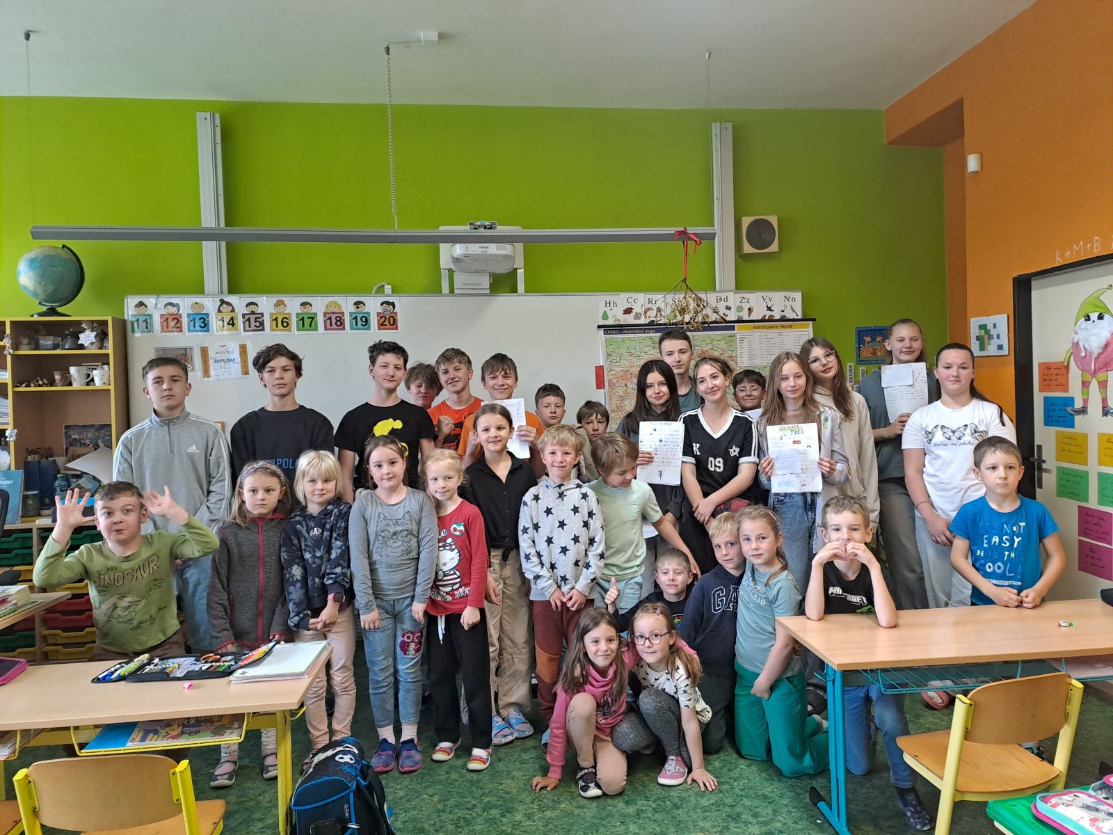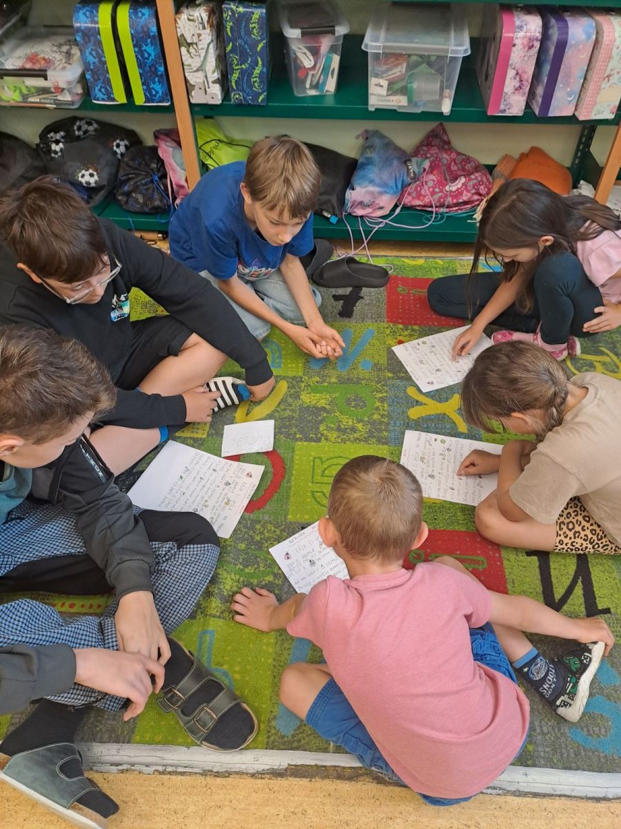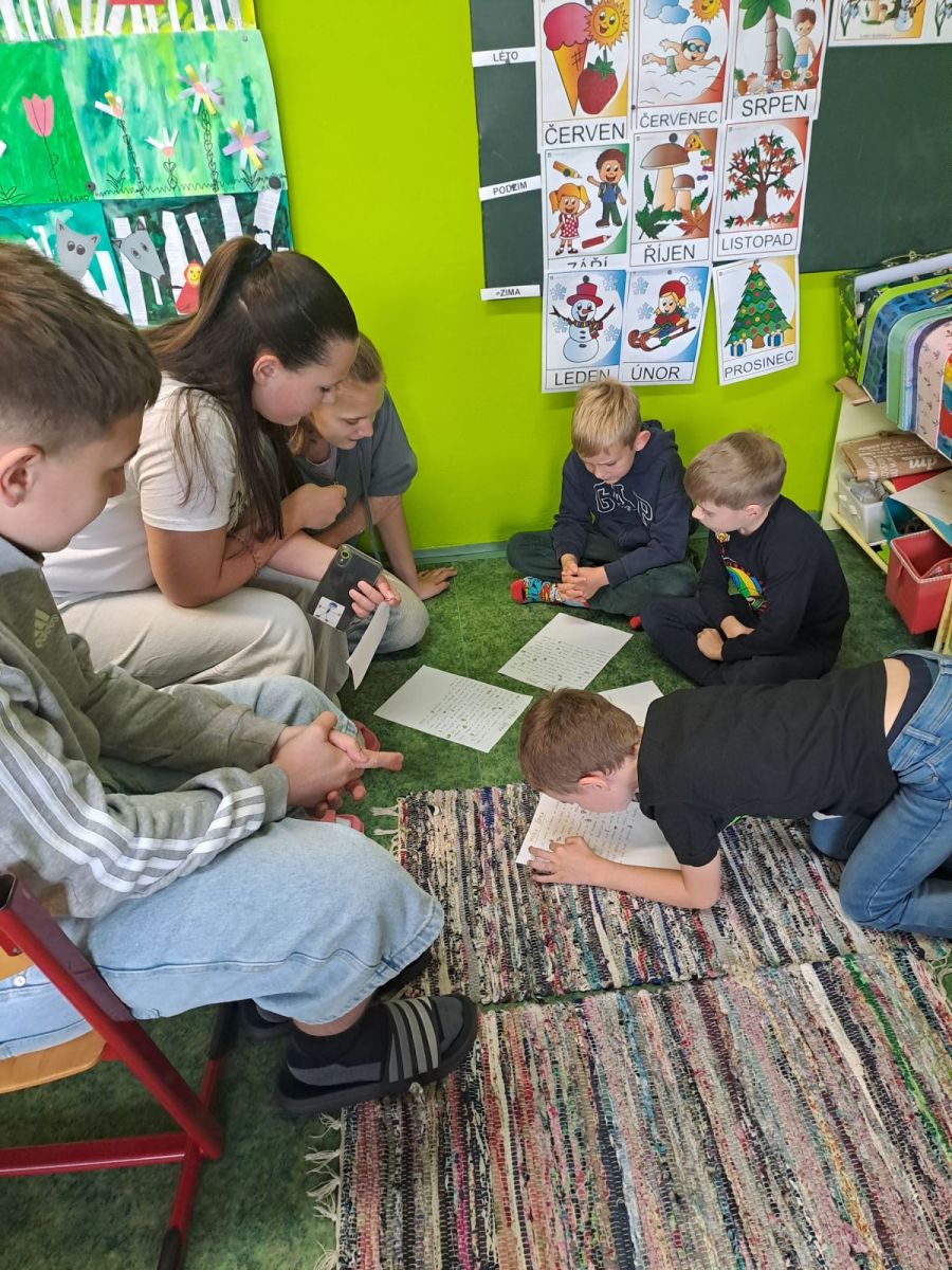 I v letošním roce si připravily třídy 7.A a 7.C pro prvňáky malované čtení – příběhy, jejichž součástí jsou drobné ilustrace. Prvňáčci si mohli přečíst příběh o nalezeném kocourkovi, jednorožci, sněhulákovi nebo traktůrku. Po společném čtení si děti o příbězích popovídaly. Nadšení bylo zřejmé na obou stranách.