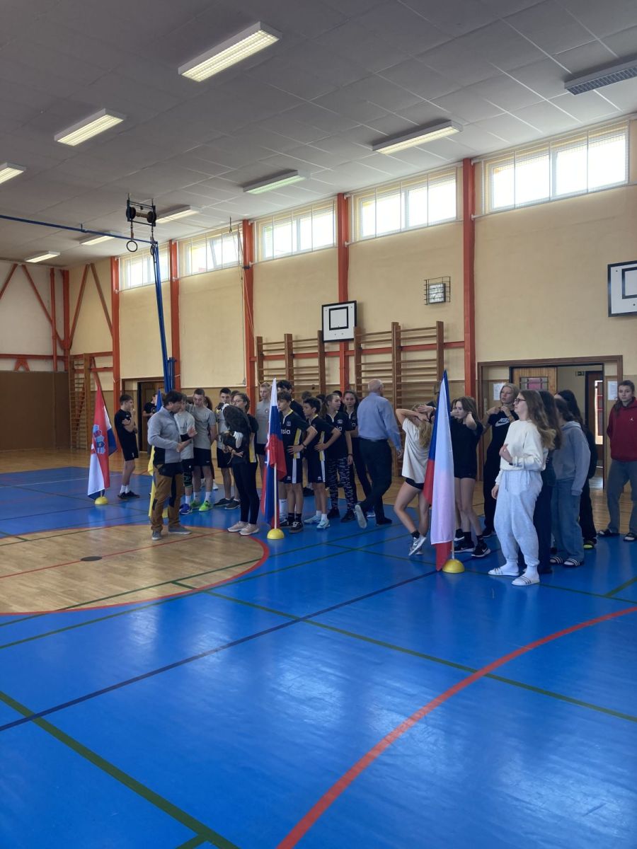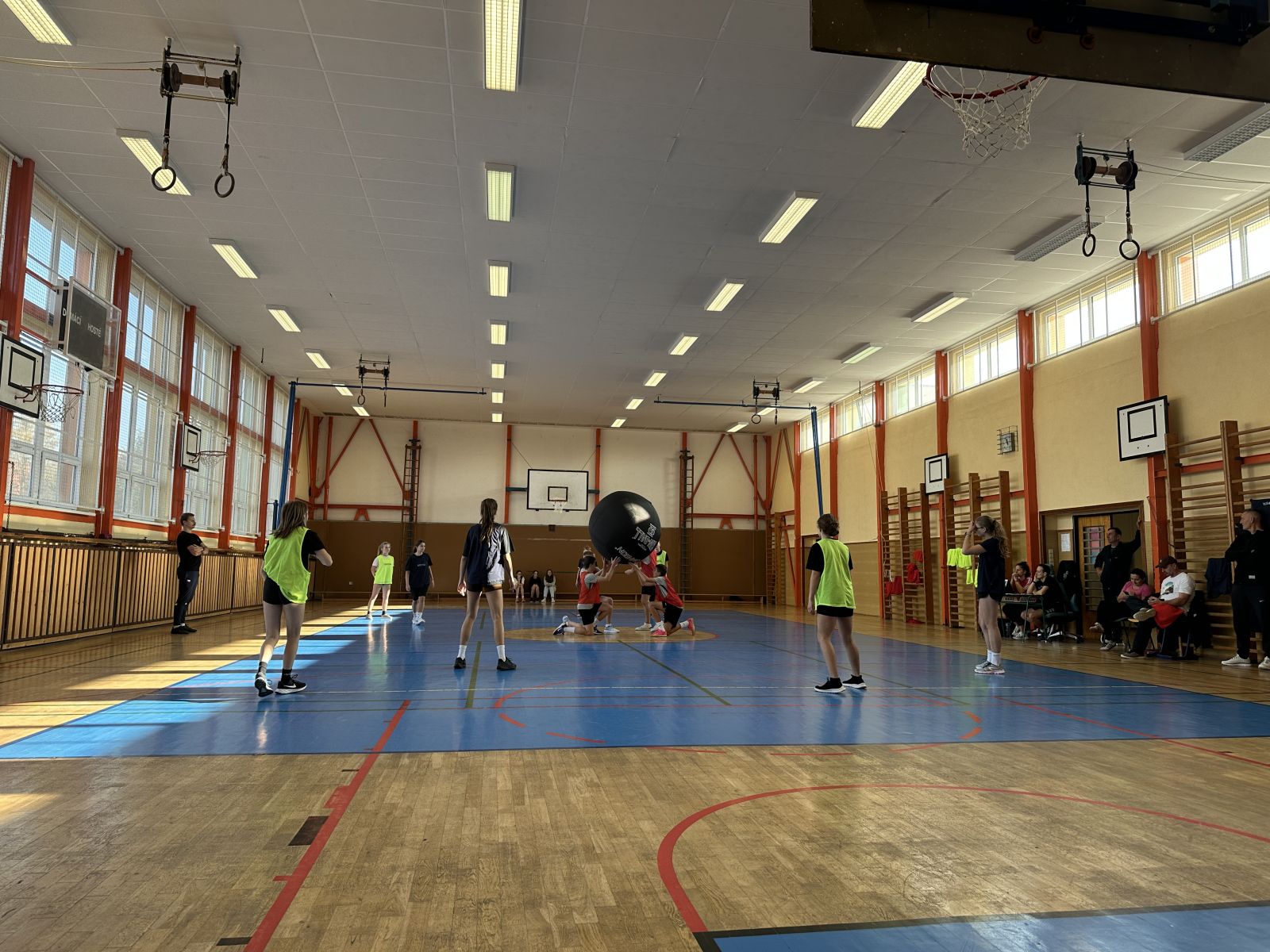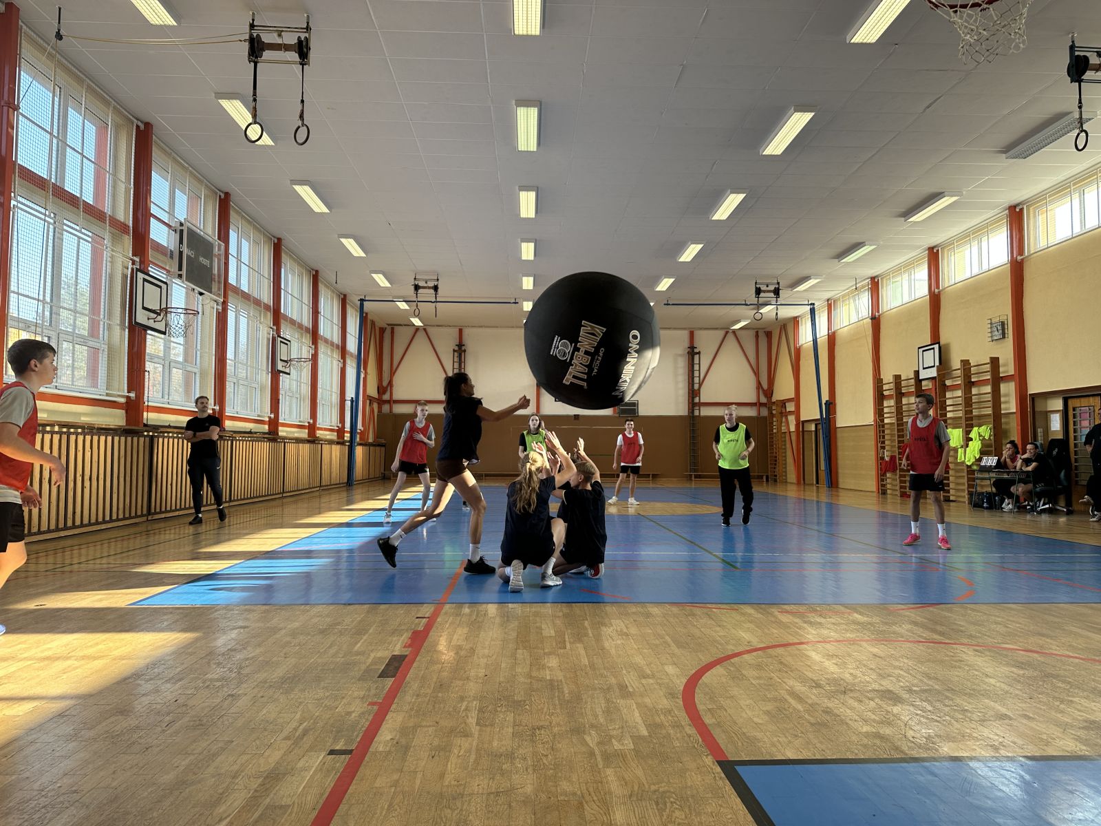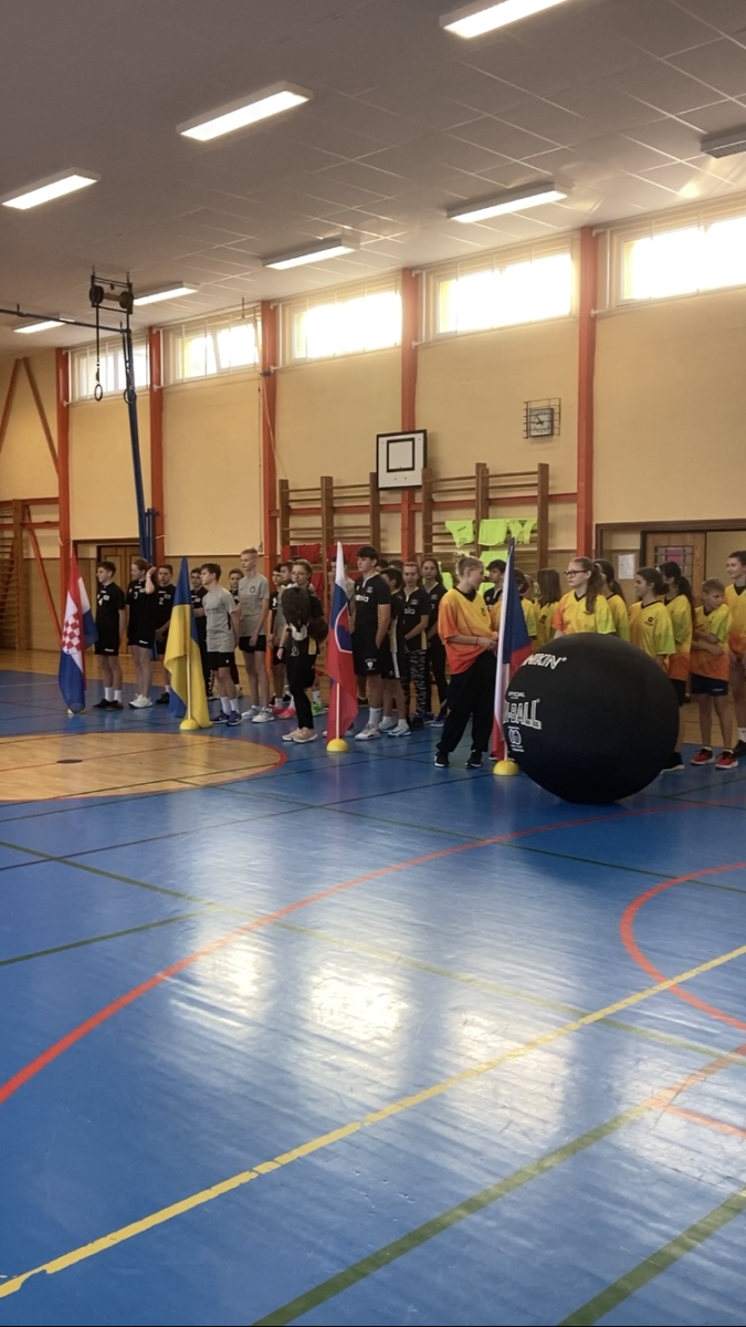 Ve dnech 7. – 9. 11. 2024 naši školu navštívily tři výpravy sportovců partnerských škol. Jednalo se o smíšené týmy žáků partnerských škol z Chorvatska (Osnovnaja škola Josipa Kozaraca), ze Slovenska (Mateřská a základní škola Maxmiliána Hela) a z Ukrajiny (Perečínské lyceum). Žáci si poměřili své síly při společném utkání v poměrně novém sportu s názvem Kin-ball. Jedná se teprve o 20 let starý sport, který vznikl v Kanadě a postupně se díky své oblibě rozšířil do celého světa. Celá hra spočívá v udržení velkého až 1,2 m v průměru širokého míče ve vzduchu bez dotyku země, stropu a stěn při společné hře tří týmů. Vždy jeden tým hraje na jeden ze dvou zbylých týmů.