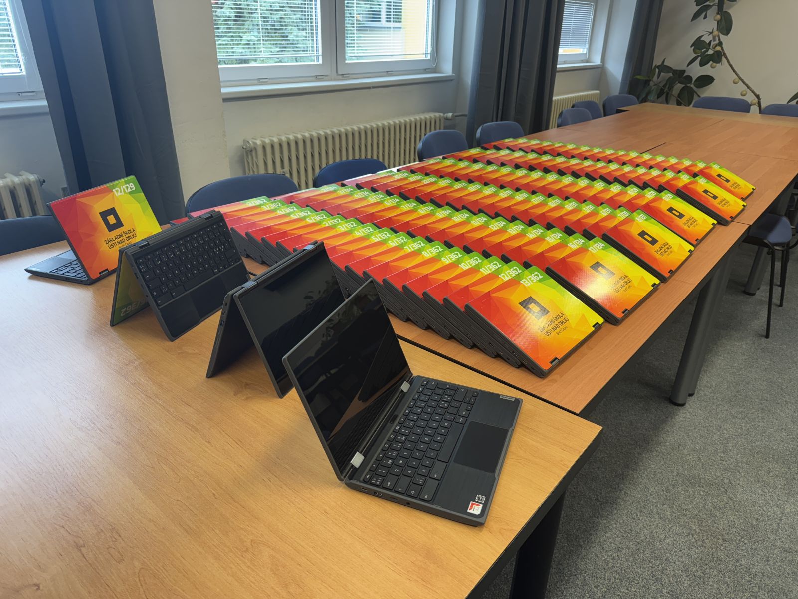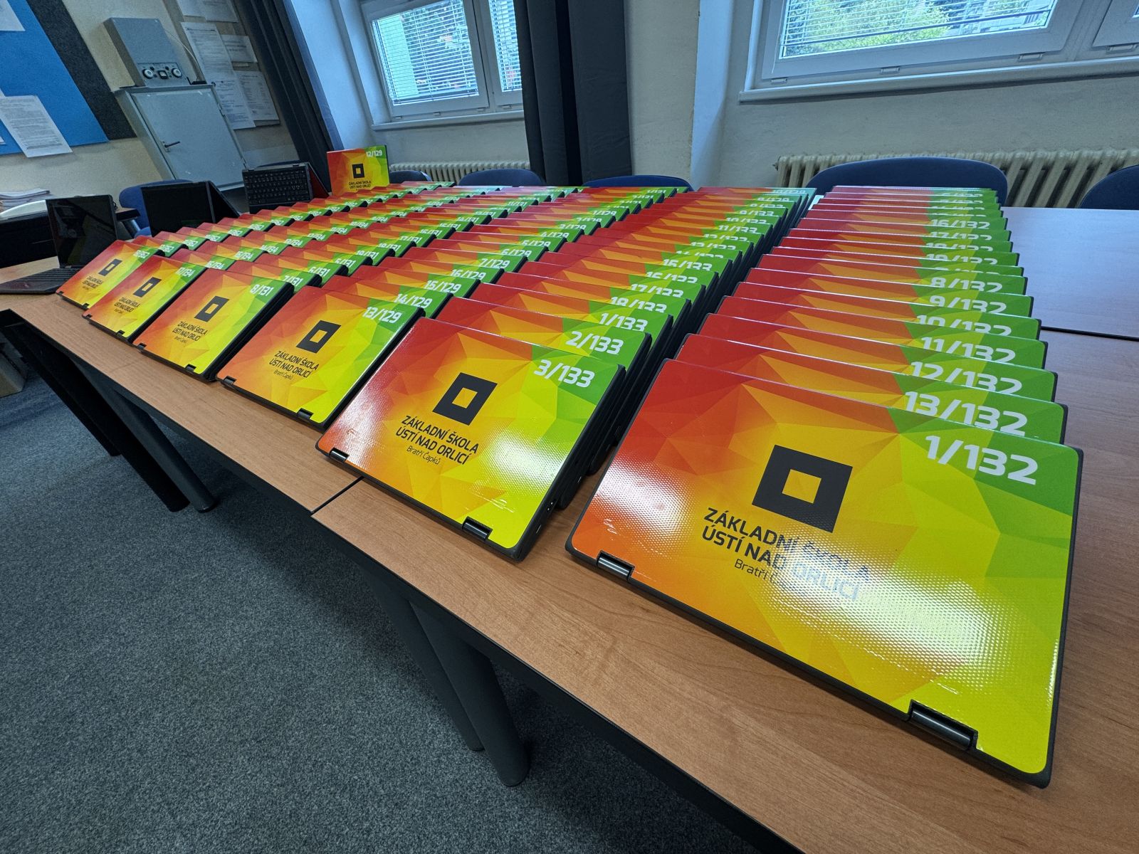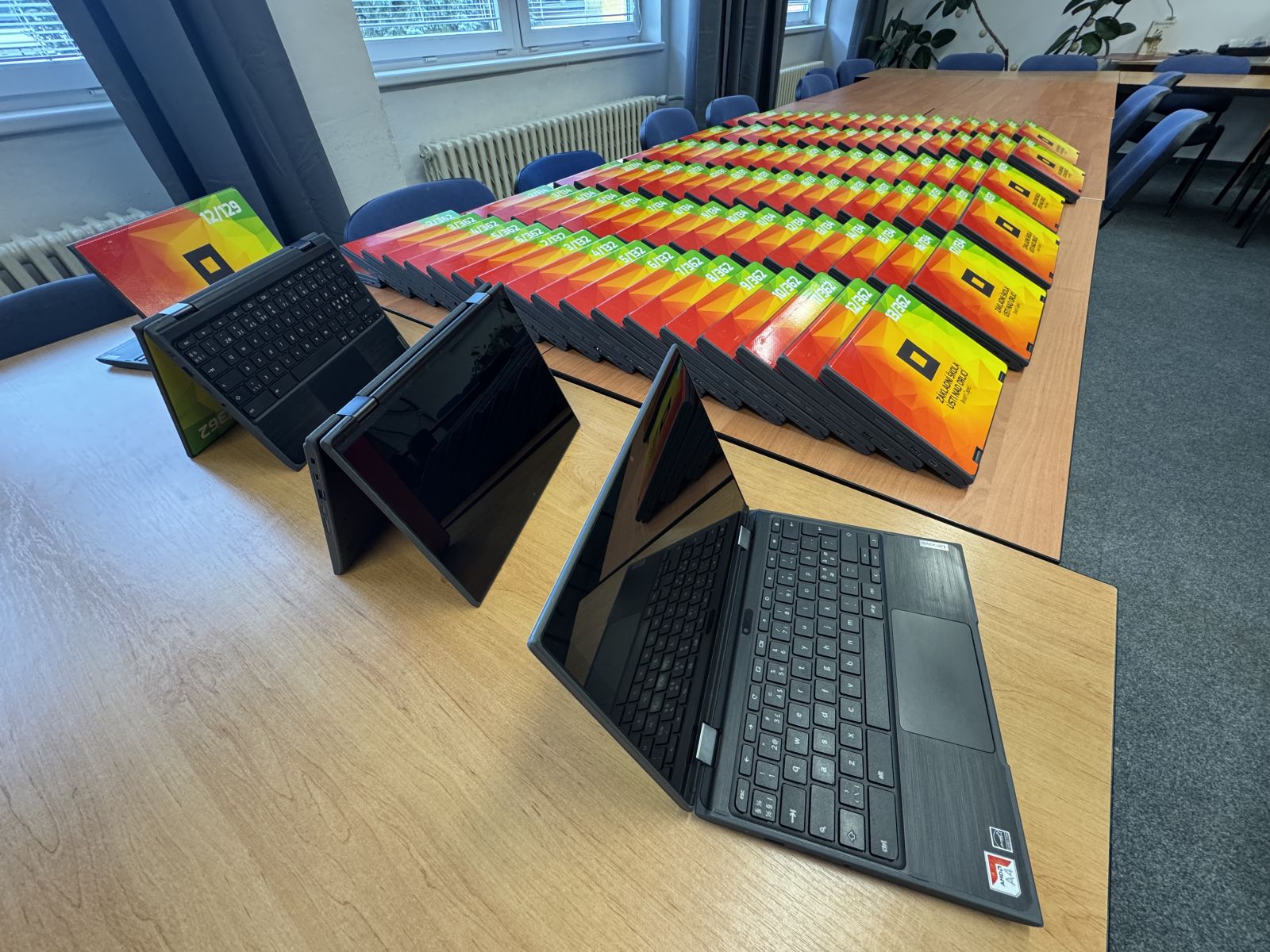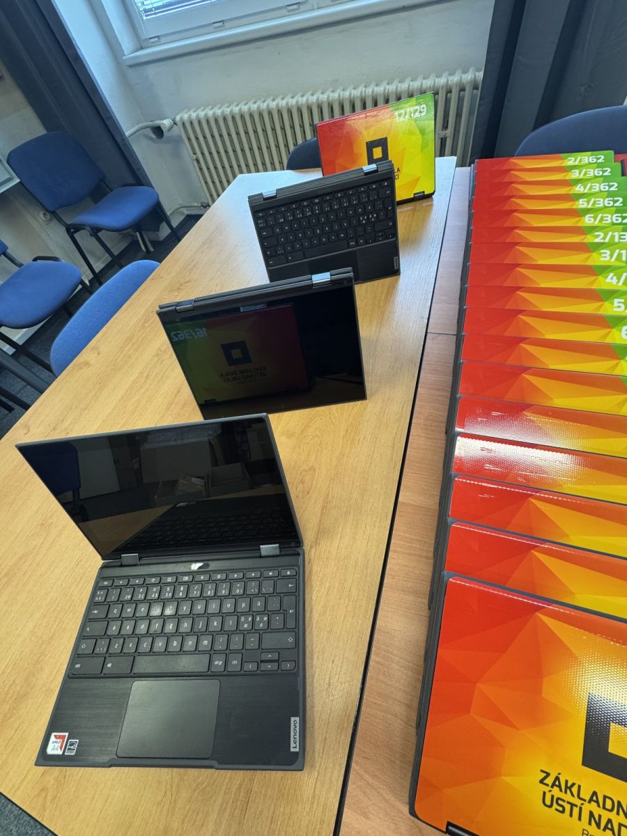 Na náš druhý stupeň přistálo 110 ks konvertibilních Chromebooků – a nejsou to žádní křehcí návštěvníci! Tito krasavci v armádním provedení přežijí polití, pád ze stolu i občasné „experimenty“ žáků.