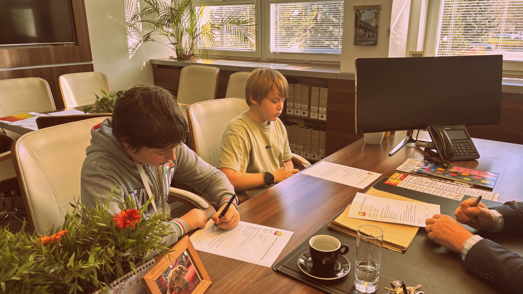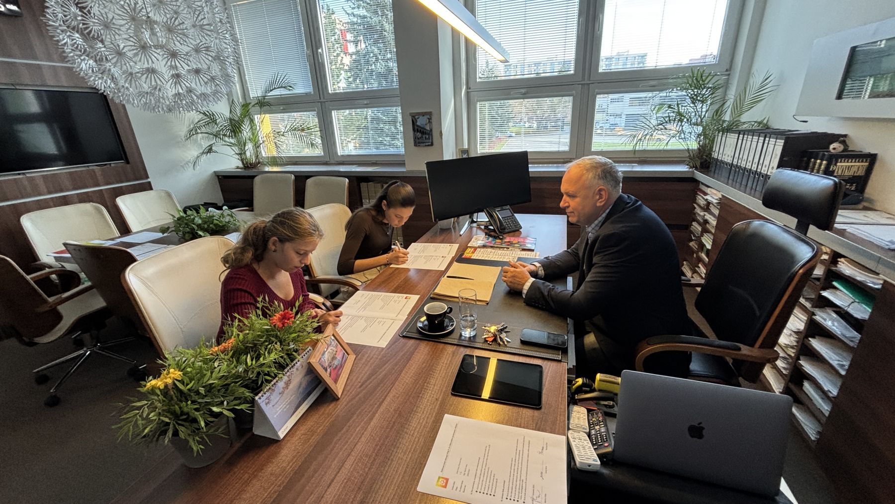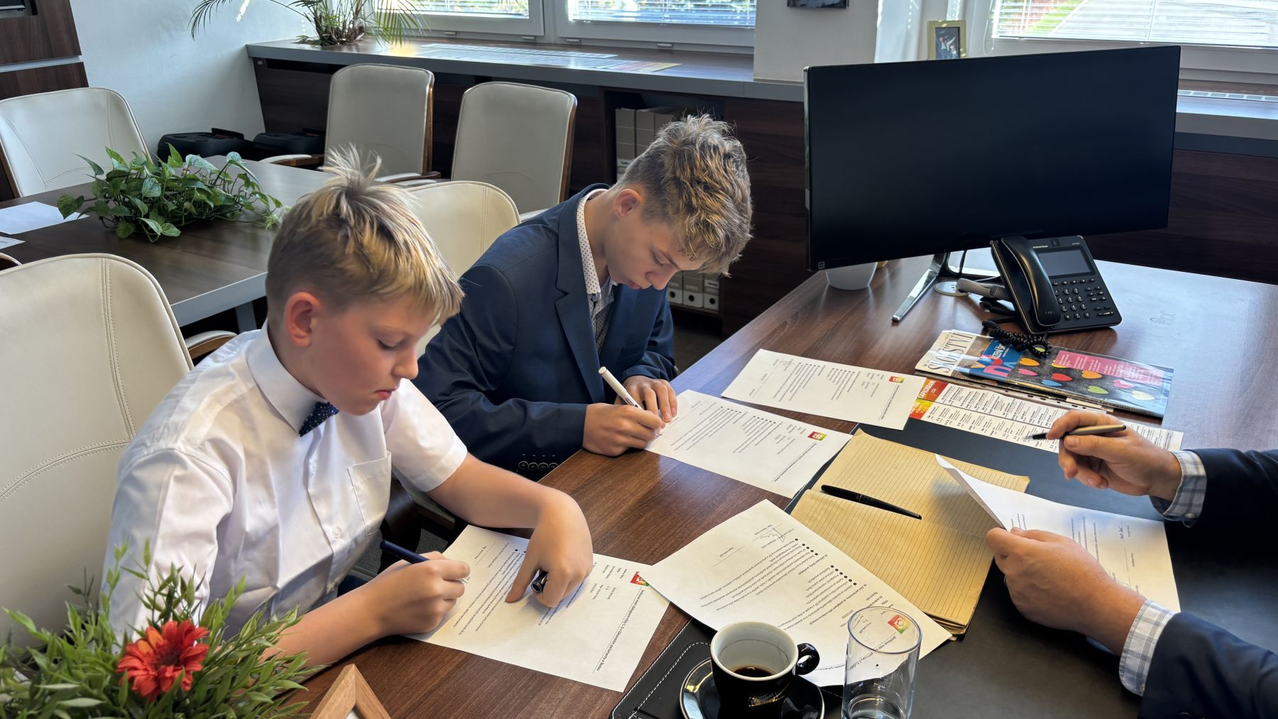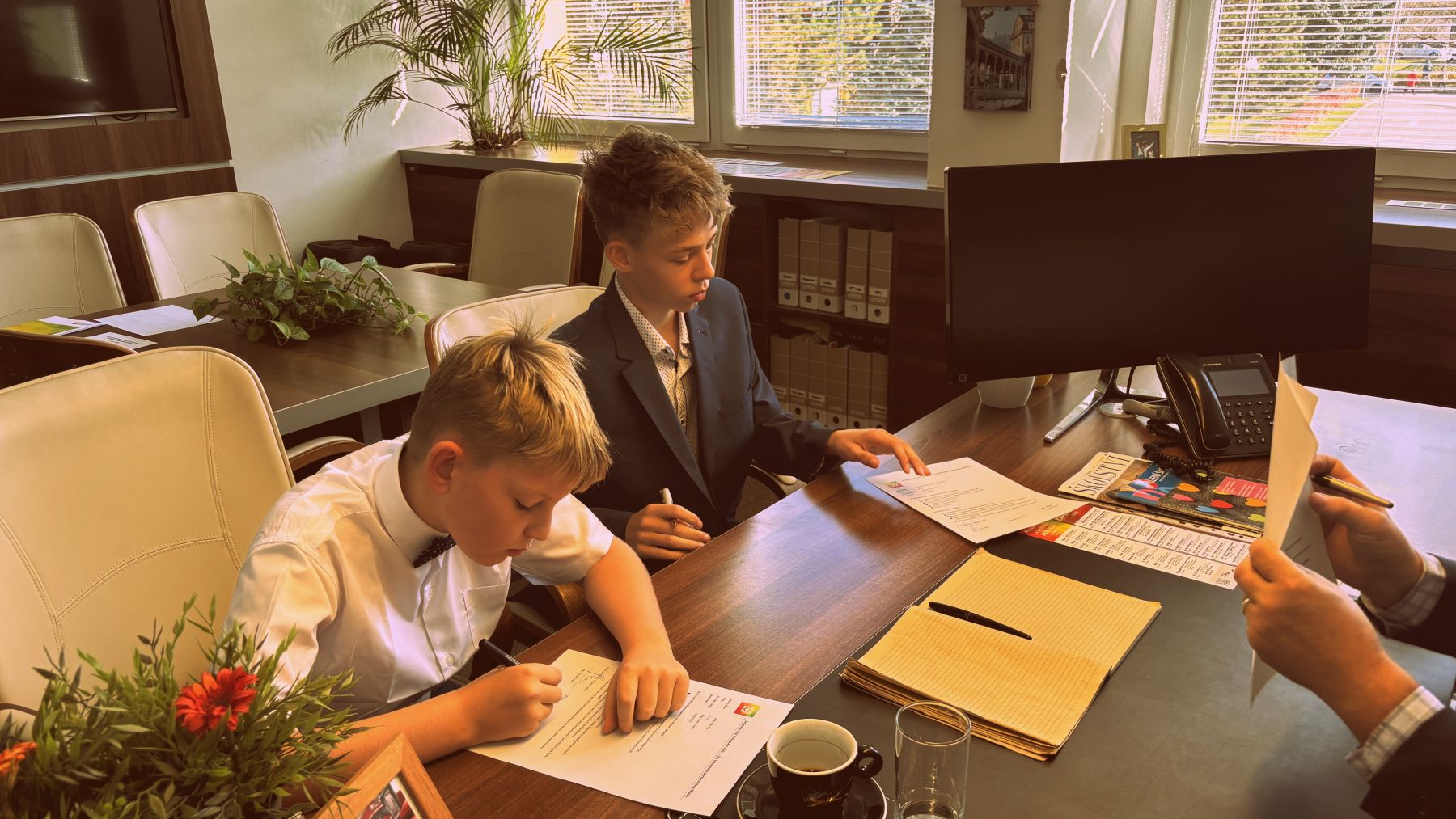 Pan ředitel s dětmi prošel jednotlivé body smlouvy a rozhodně nešlo o pouhou formální schůzku. Každý měl prostor vyjádřit svůj názor, sdílet postřehy či dotazy. Což dodalo schůzce atmosféru vzájemného respektu a otevřeného dialogu. Setkání probíhala v příjemné atmosféře, která na závěr vyvrcholila podpisem smluv.