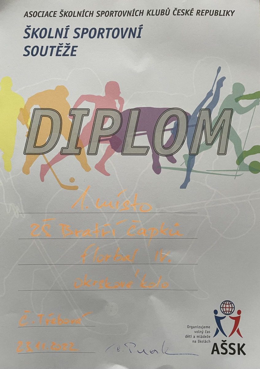 Ve středu 23.11. se chlapci z 8. a 9. tříd zúčastnili Okrskového kola florbalového turnaje O pohár MŠMT v České Třebové. Turnaje se zúčastnily čtyři další školy (Gymnázium ČT, ZŠ Habrmanova ČT, ZŠ Ústecká ČT a ZŠ Komenského ÚO) nad kterými dokázali naši chlapci zvítězit a po výsledcích 5:2, 4:2, 8:0 a 7:1 si zajistili postup do Okresního kola. To se koná ve čtvrtek 1.12. v Brandýse nad Orlicí.