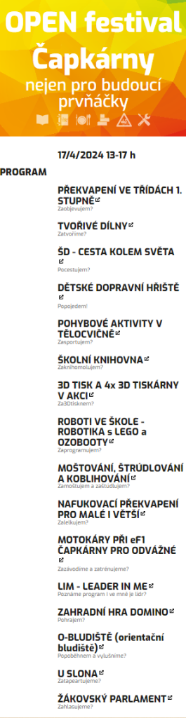 A je to tady? Už jste to slyšeli? Čapkárna pořádá nejen pro nejmenší OPEN festival školy, který bude opět plný zajímavých aktivit!