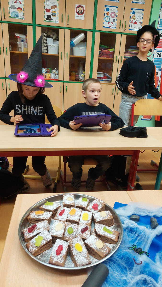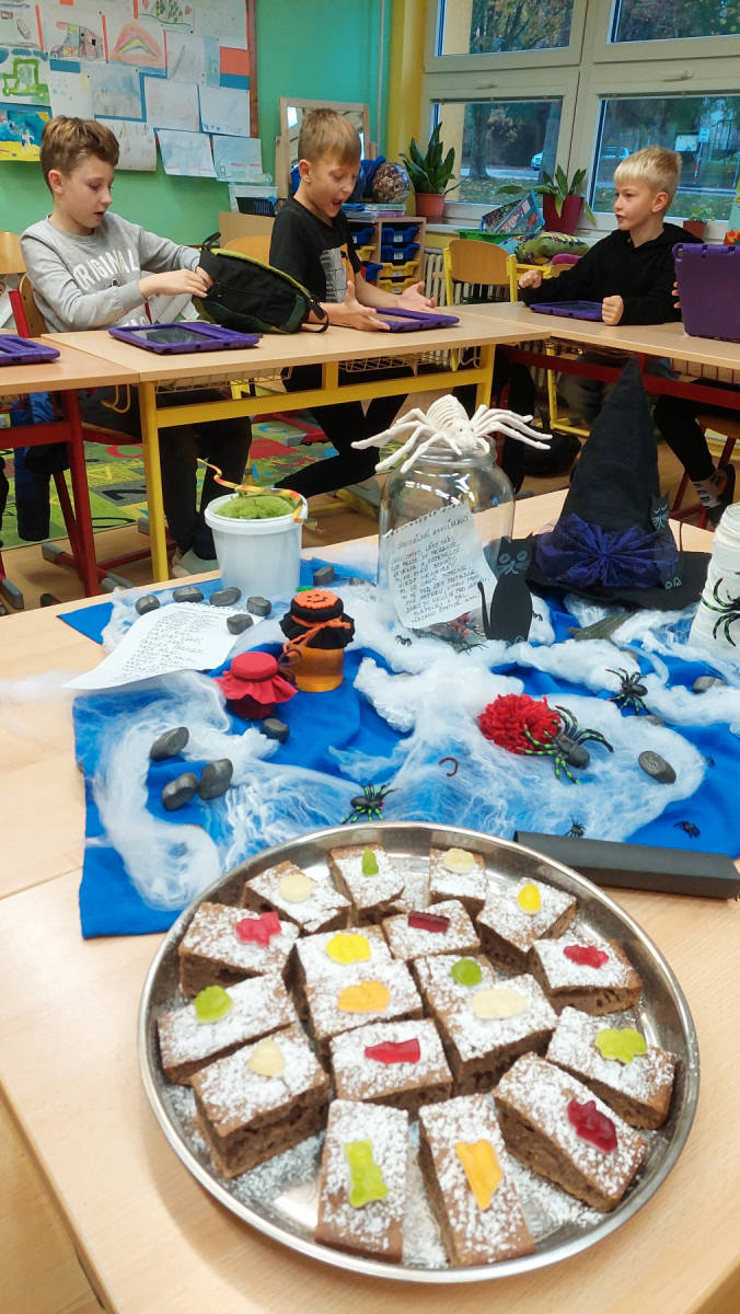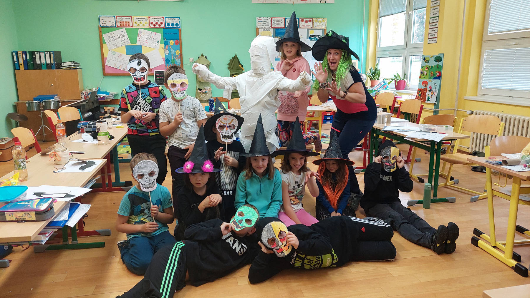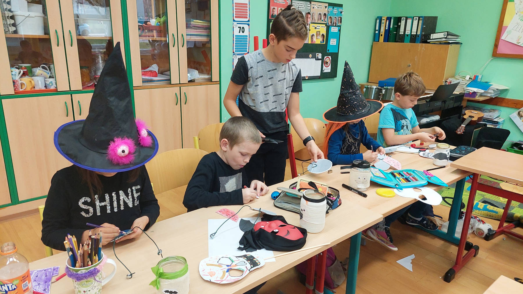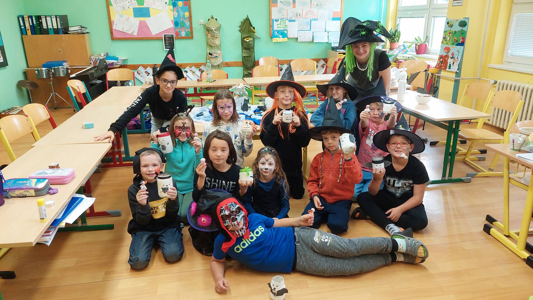 Halloweensky připravený program byl velmi nabitý. Děti si na školních tabletech vyzkoušely, pod vedením starších žáků, úkoly a doplňovačky, které je velmi bavily. Proběhly strašidelné hry na jemnou a hrubou motoriku, hráli jsme na boomwhackers, zpívali, vyráběli kouzelné lektvary a prováděli pokusy.