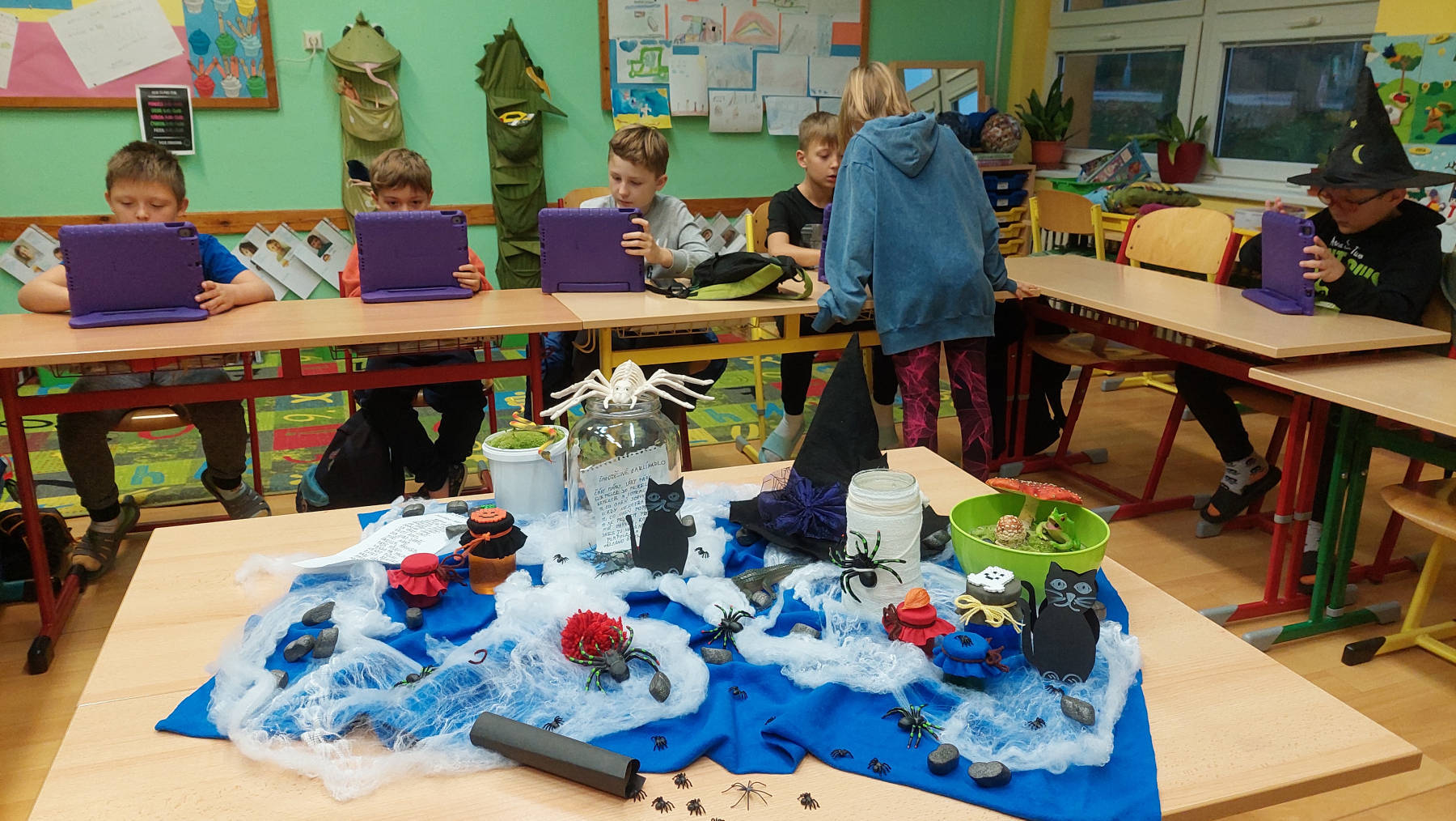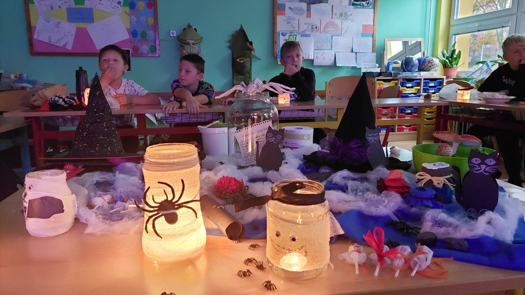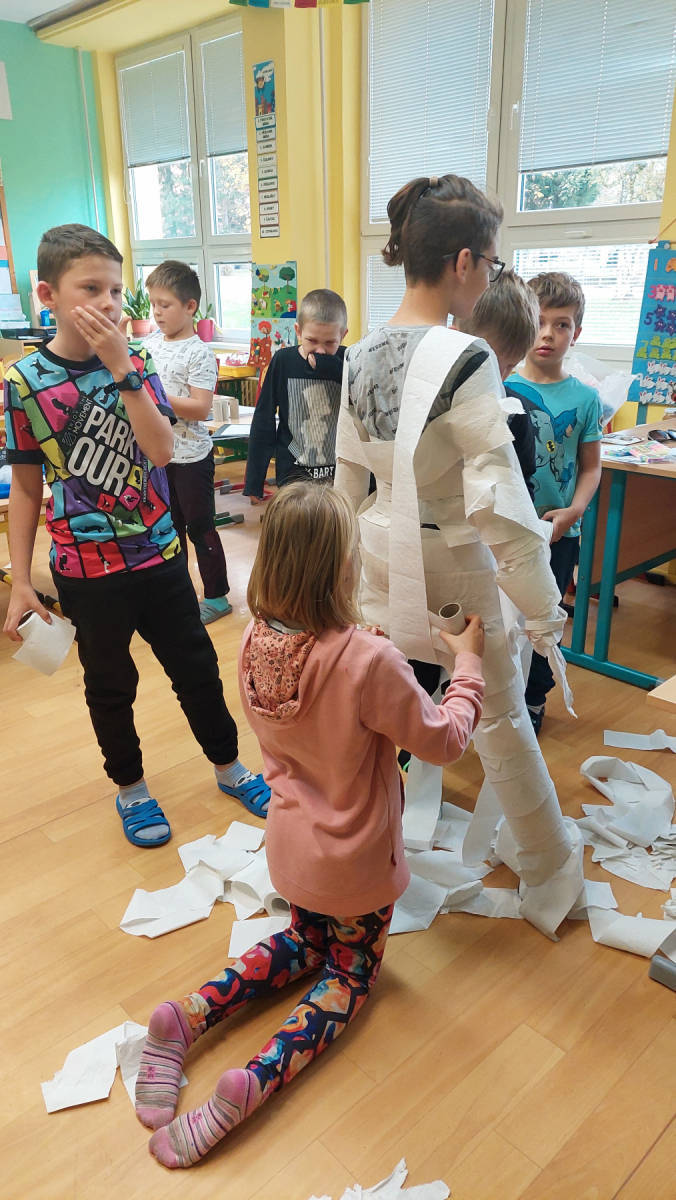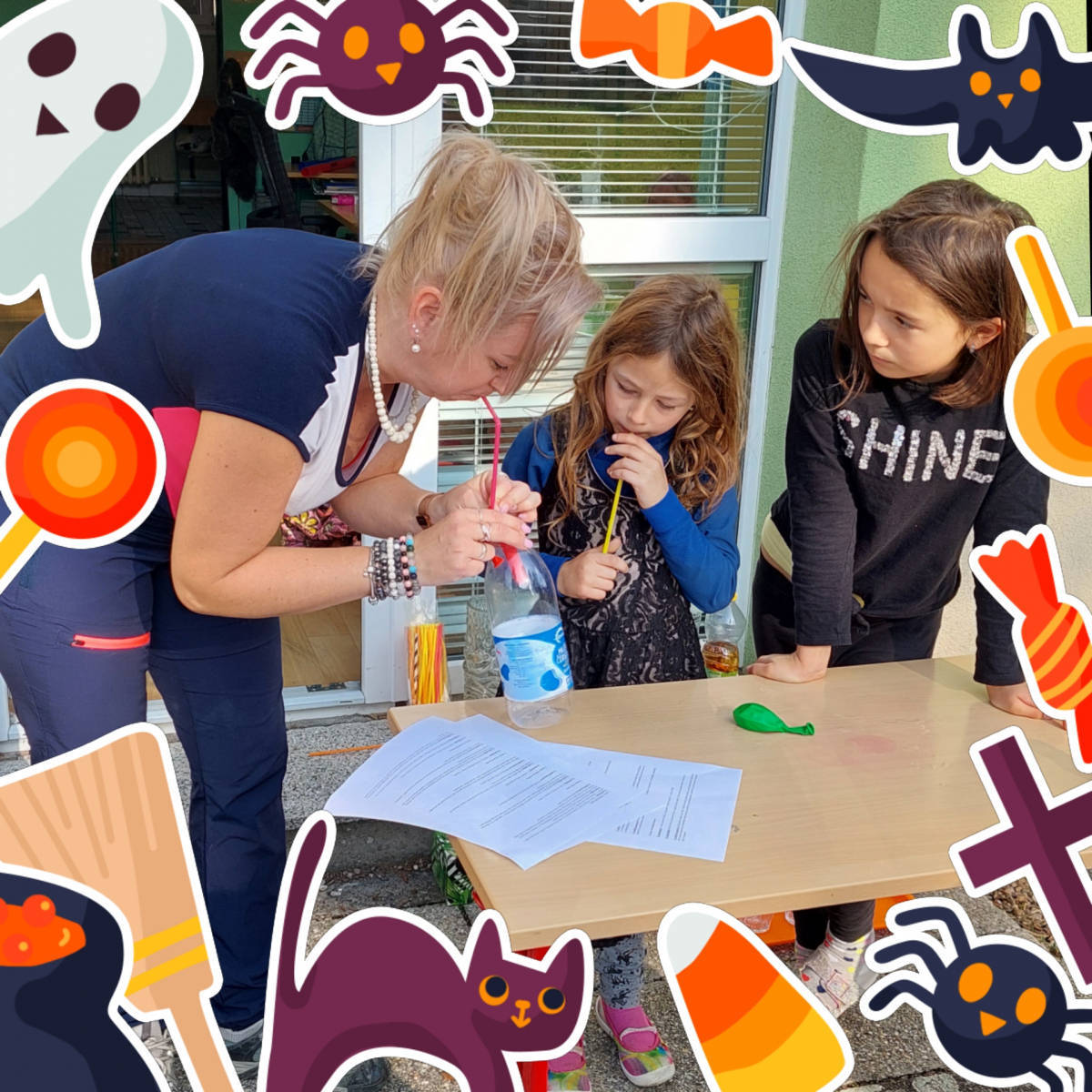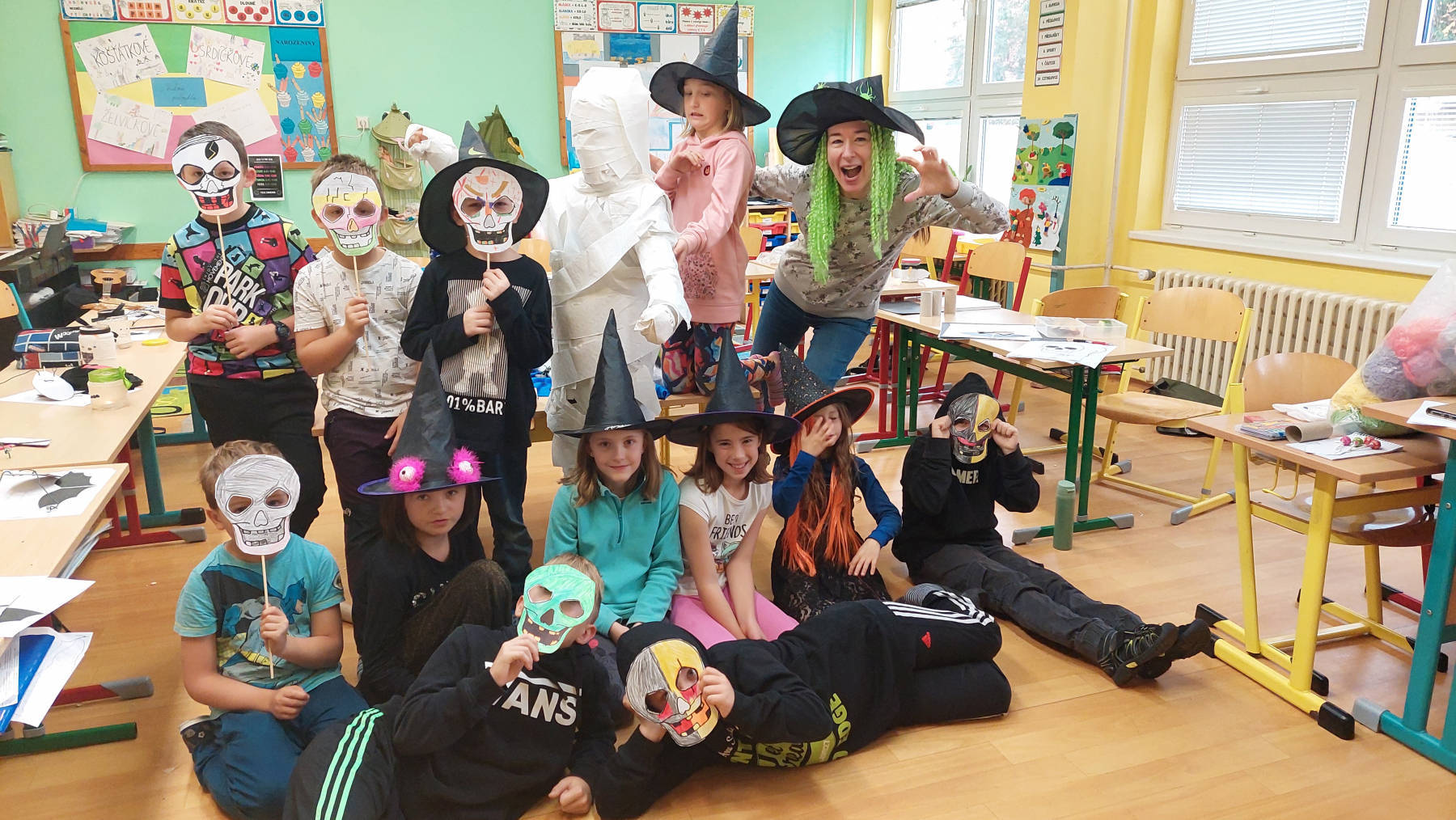 Halloweensky připravený program byl velmi nabitý. Děti si na školních tabletech vyzkoušely, pod vedením starších žáků, úkoly a doplňovačky, které je velmi bavily. Proběhly strašidelné hry na jemnou a hrubou motoriku, hráli jsme na boomwhackers, zpívali, vyráběli kouzelné lektvary a prováděli pokusy.