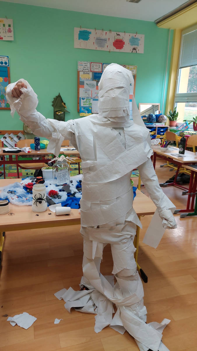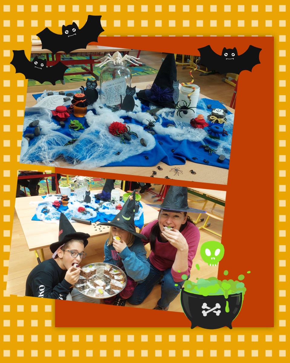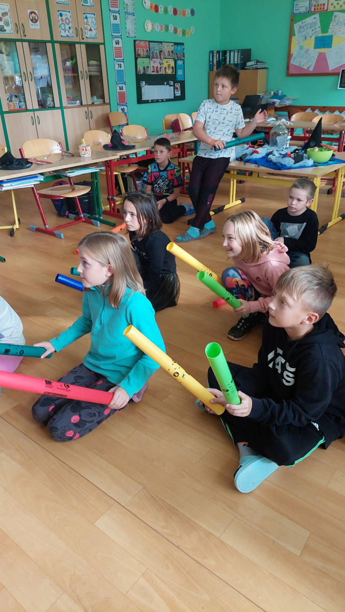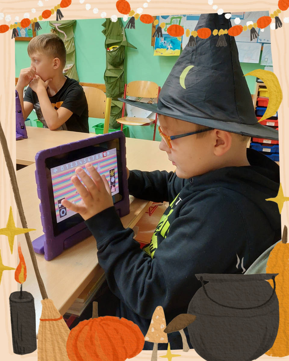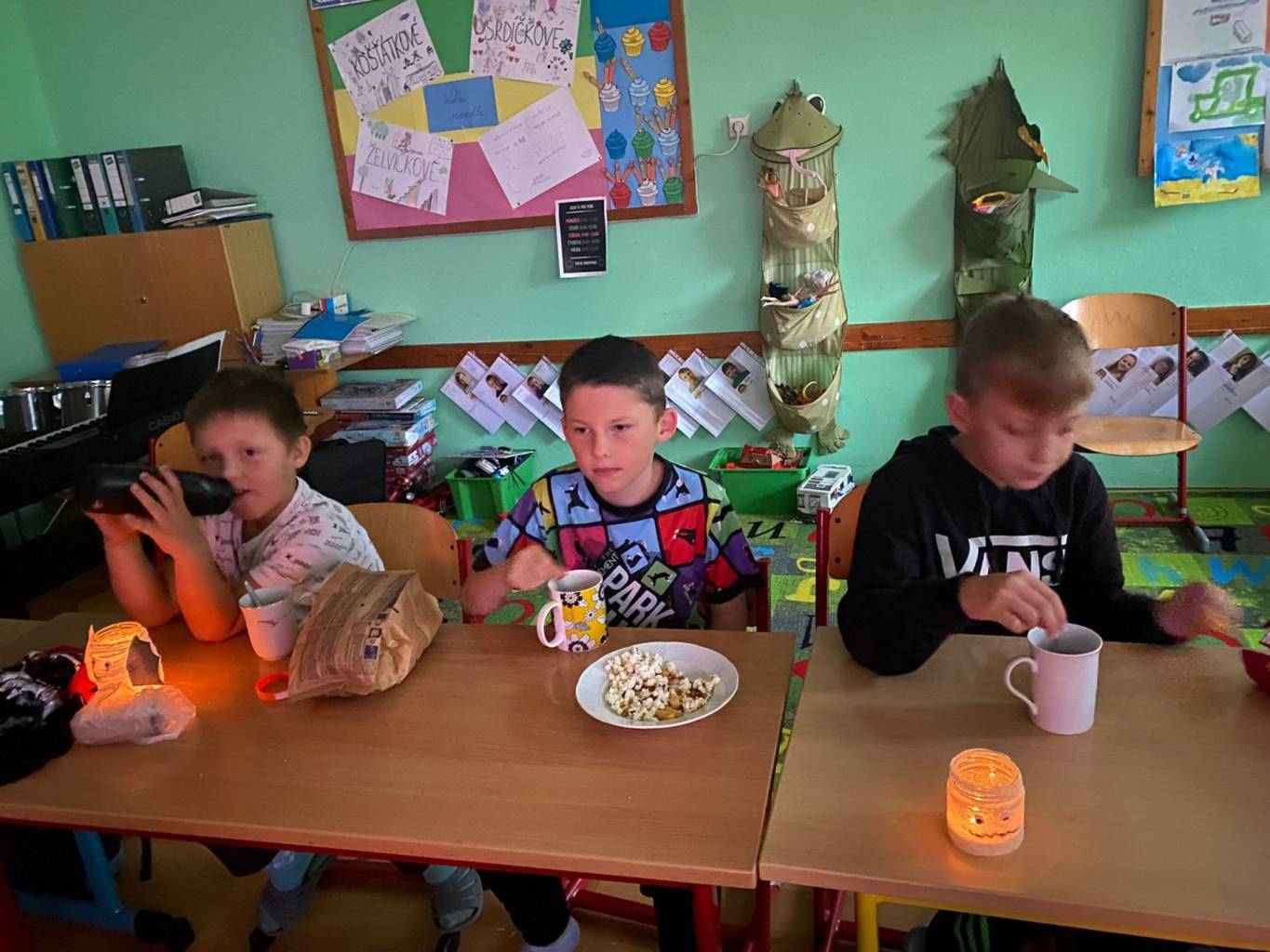 Halloweensky připravený program byl velmi nabitý. Děti si na školních tabletech vyzkoušely, pod vedením starších žáků, úkoly a doplňovačky, které je velmi bavily. Proběhly strašidelné hry na jemnou a hrubou motoriku, hráli jsme na boomwhackers, zpívali, vyráběli kouzelné lektvary a prováděli pokusy.