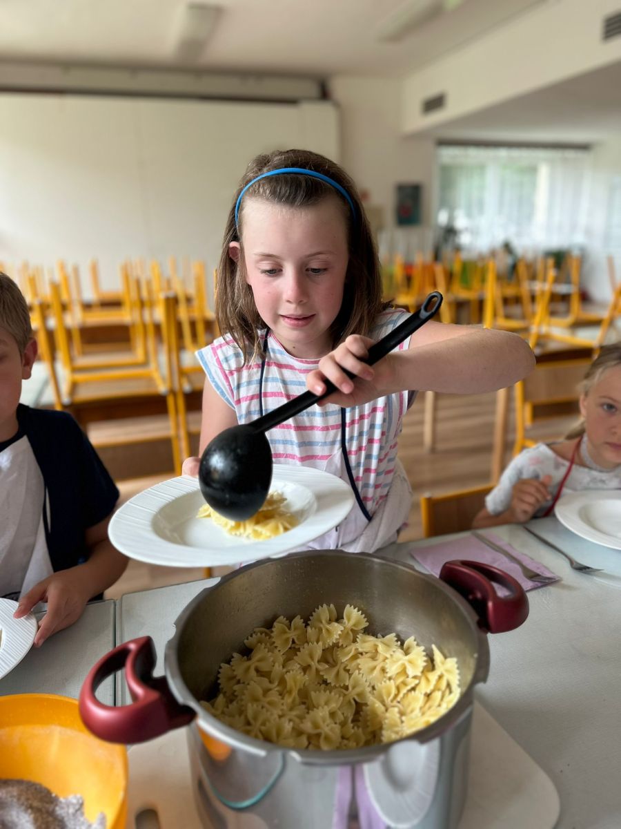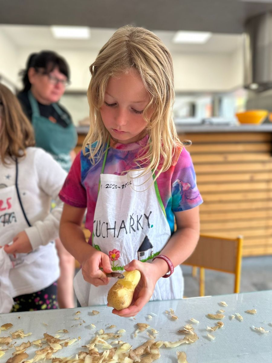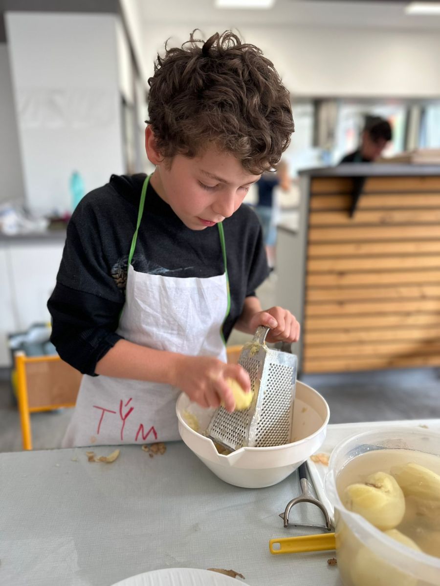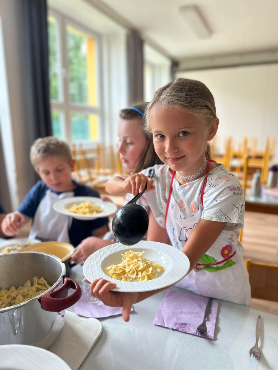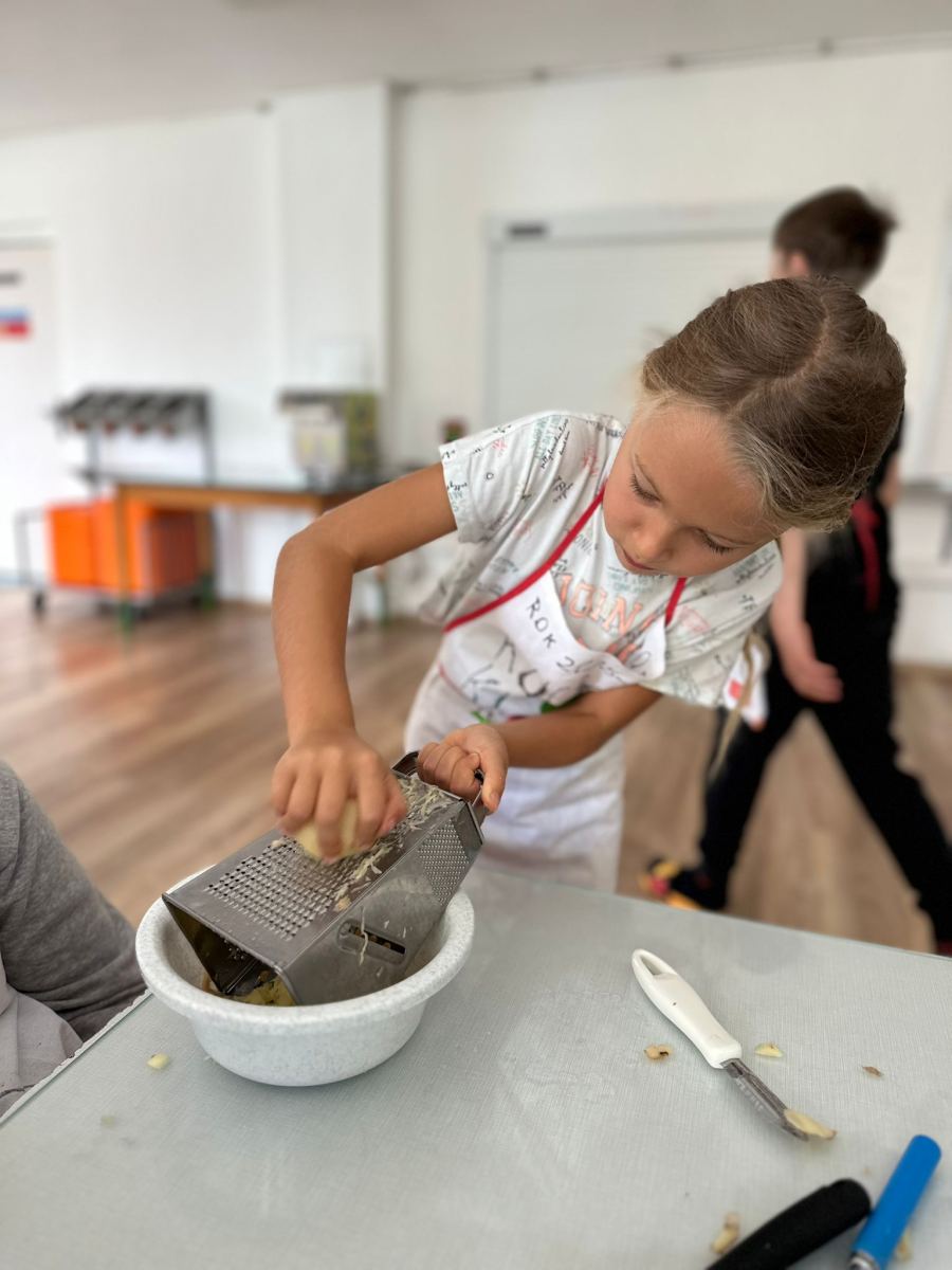 Každý den jsme se pustili do nové výzvy, od jednoduchých až po složitější hlavní chody a sladké dobroty. Děti pracovaly ve 4 týmech, rozdělovaly si úkoly, a hlavně spolupracovaly. Nechyběly ani týmové zástěry, ochutnávky a radost z povedených pokrmů.