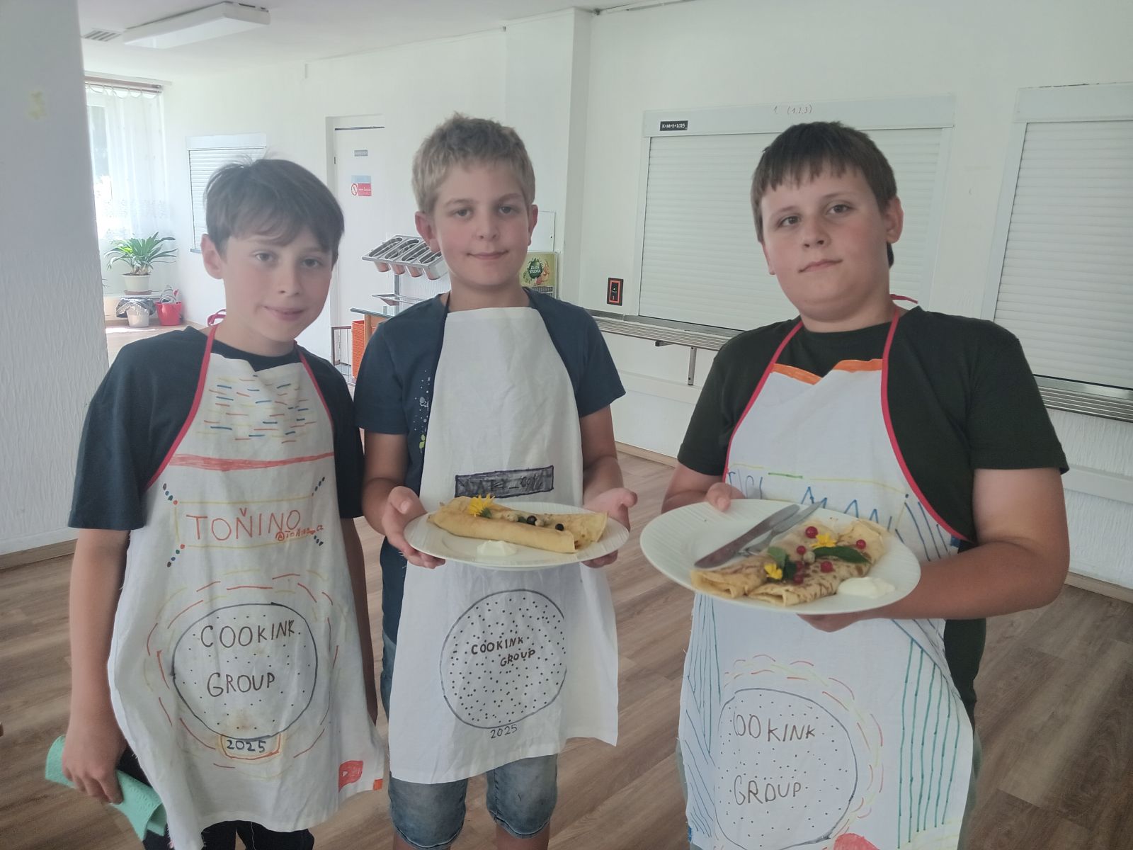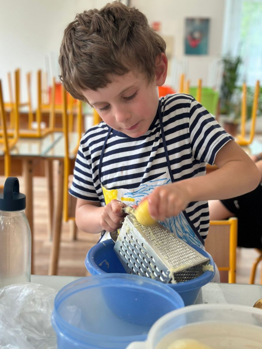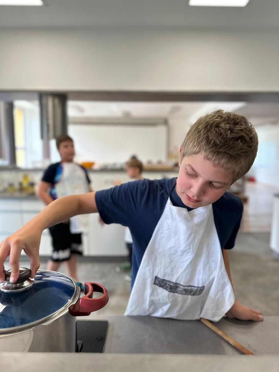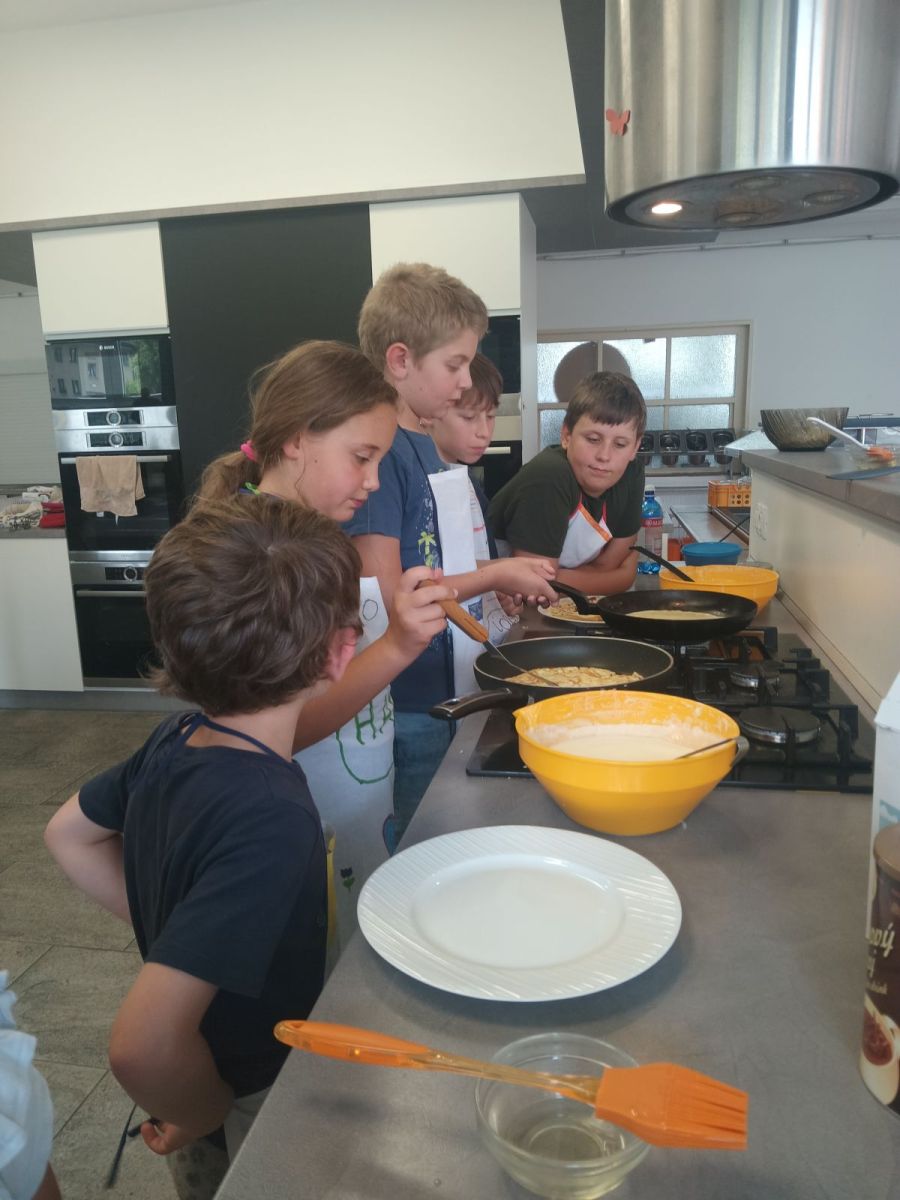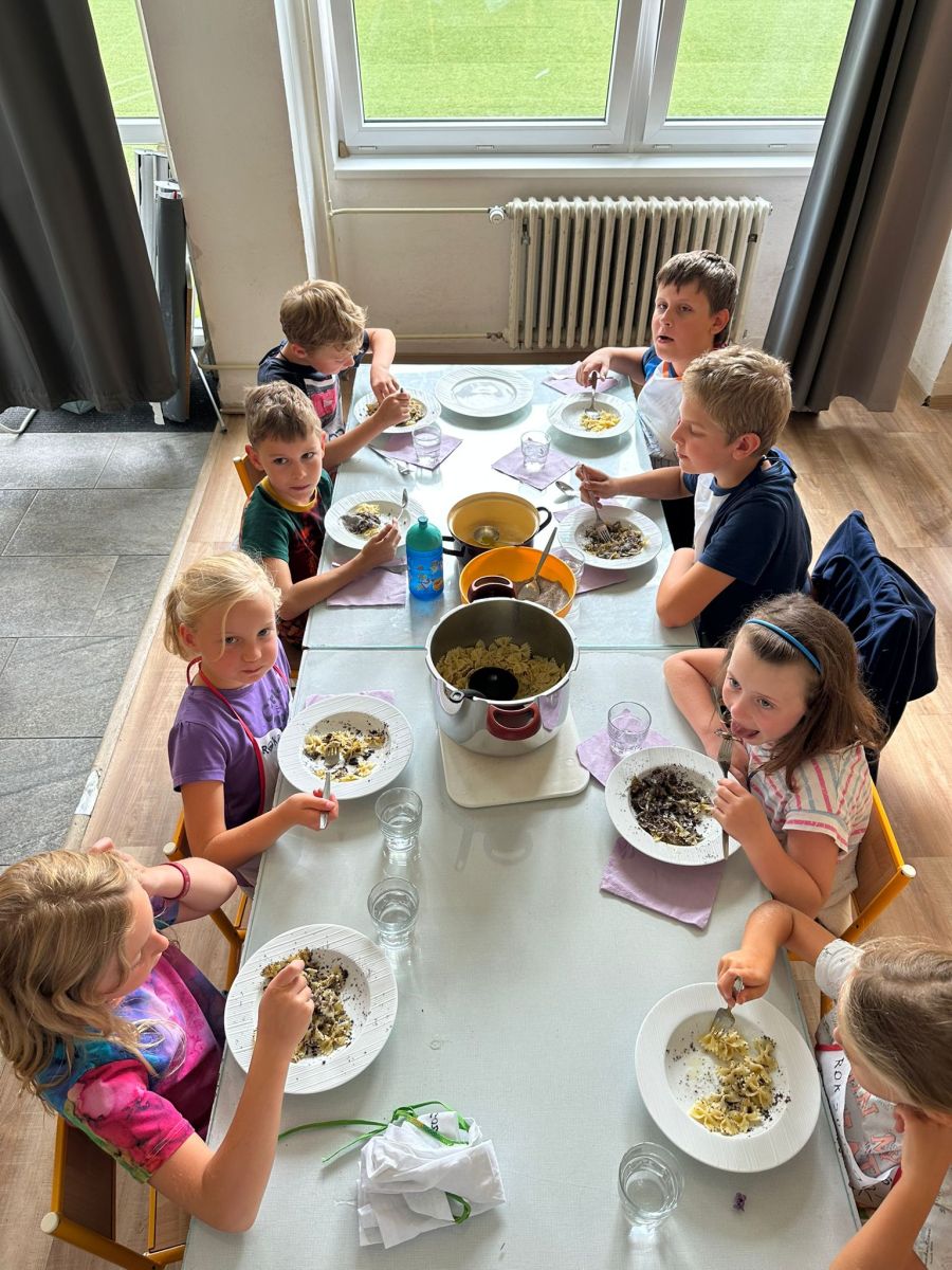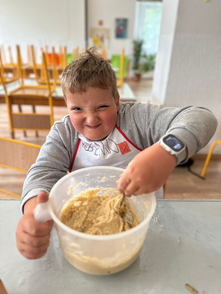 Každý den jsme se pustili do nové výzvy, od jednoduchých až po složitější hlavní chody a sladké dobroty. Děti pracovaly ve 4 týmech, rozdělovaly si úkoly, a hlavně spolupracovaly. Nechyběly ani týmové zástěry, ochutnávky a radost z povedených pokrmů.