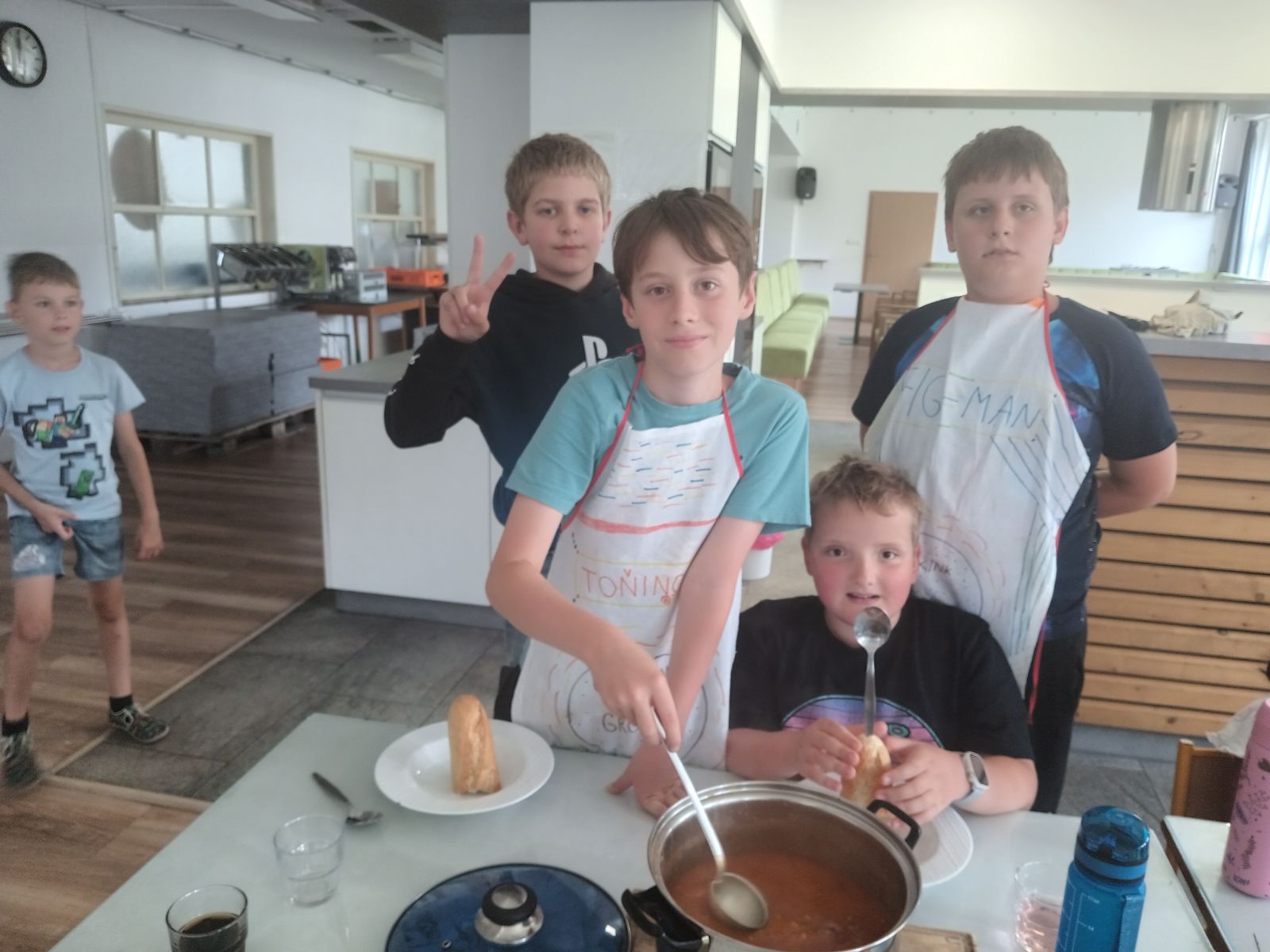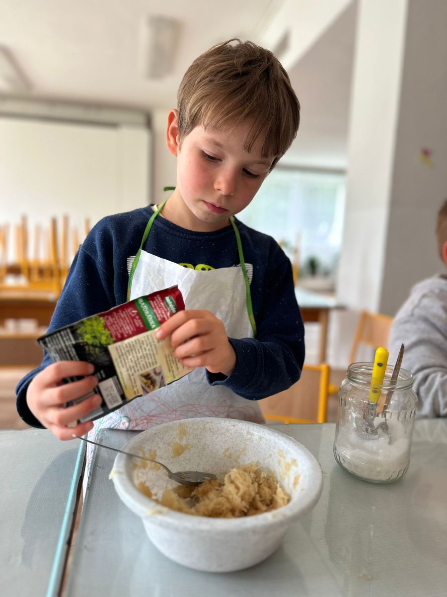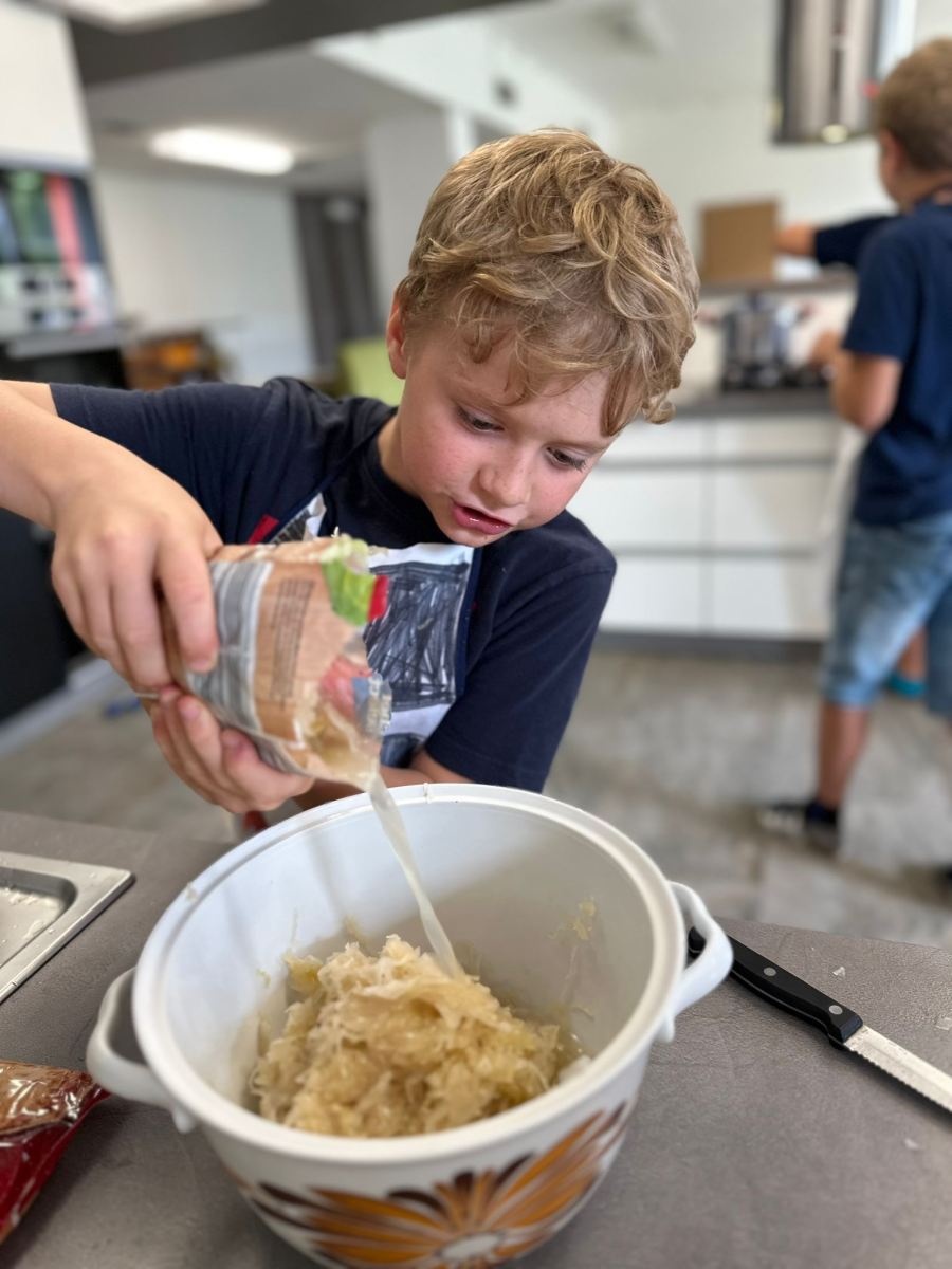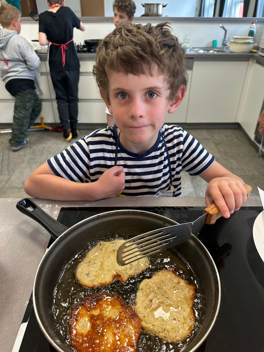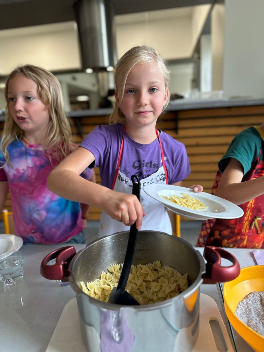 Každý den jsme se pustili do nové výzvy, od jednoduchých až po složitější hlavní chody a sladké dobroty. Děti pracovaly ve 4 týmech, rozdělovaly si úkoly, a hlavně spolupracovaly. Nechyběly ani týmové zástěry, ochutnávky a radost z povedených pokrmů.