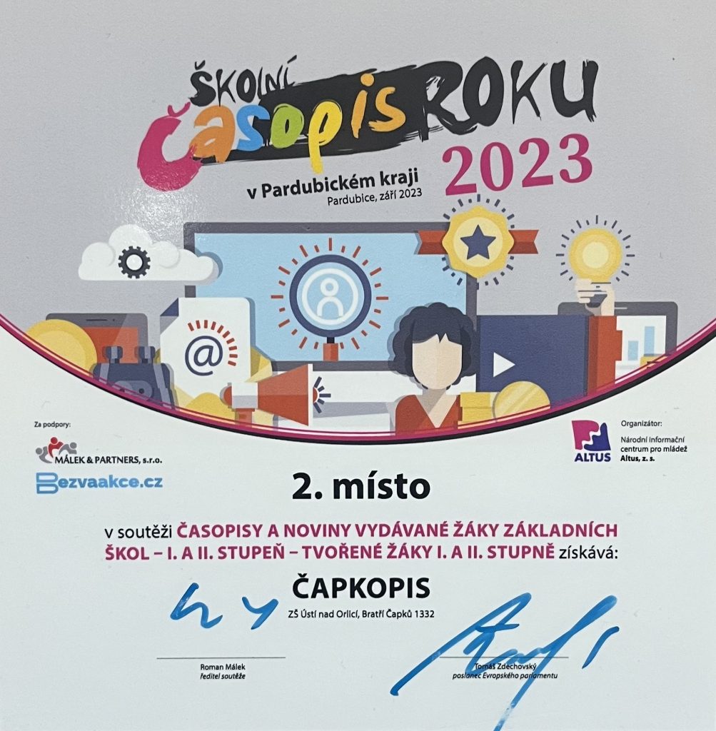 Náš Čapkopis se v soutěži Školní časopis roku umístil v krajském kole ve své kategorii na krásném druhém místě, zároveň postupuje do kola celostátního! Gratulujeme loňské redakci a těšíme se na nápady té letošní.